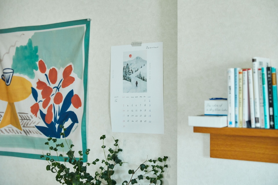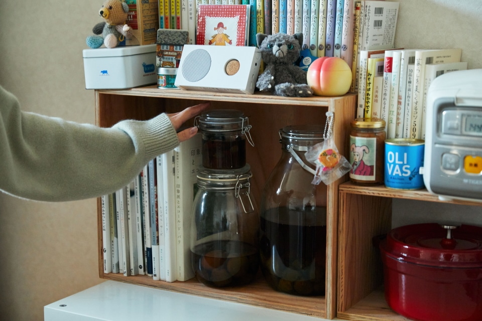 階段を上がって玄関を開けたら、おだやかな人柄がにじみ出ているお部屋が待っていました。益田ミリさんの文庫本に、美術館で収集したポストカード。壁を彩るお気に入りのハンカチーフ、年に1度つくる梅シロップ。