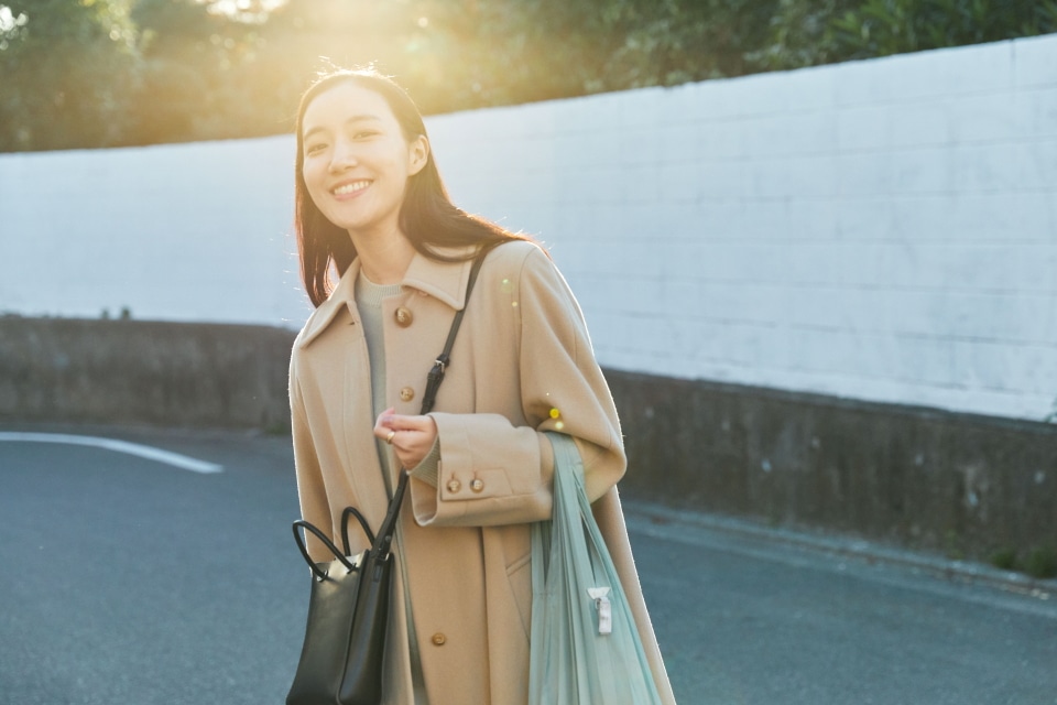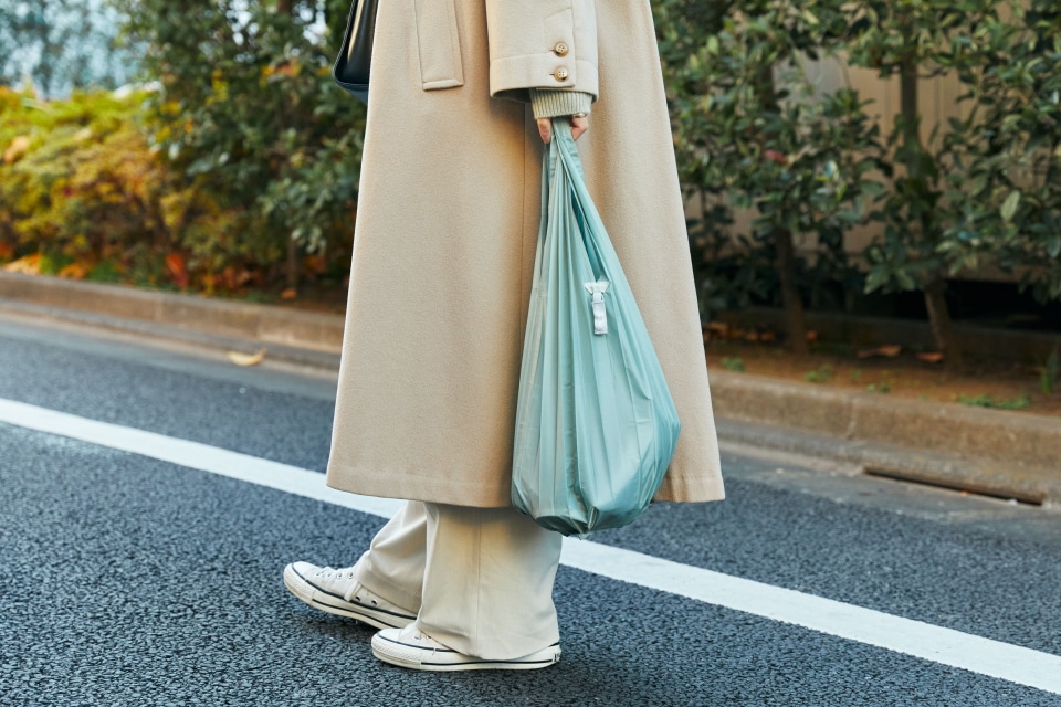 「『エコバックは差し色を選ぶ』という個人的なコーディネートルールがあるんです。ホワイトセージ色は、モノトーンコーデのアクセントになるし、服に色味があっても主張せずにフィットします。透け感があるのもかわいくて」