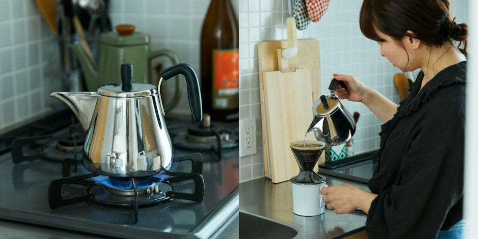 「マーナのケトル、とても使いやすいです。もともと使っていたやかんは沸騰すると熱いのでミトンが必要で…。持ち手をそのまま握れるし、お湯を細くピンポイントで注げる。これで淹れはじめてからコーヒーがおいしくなった気がします」