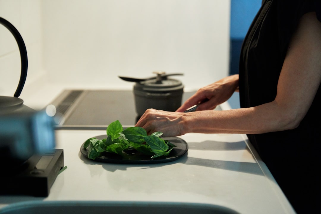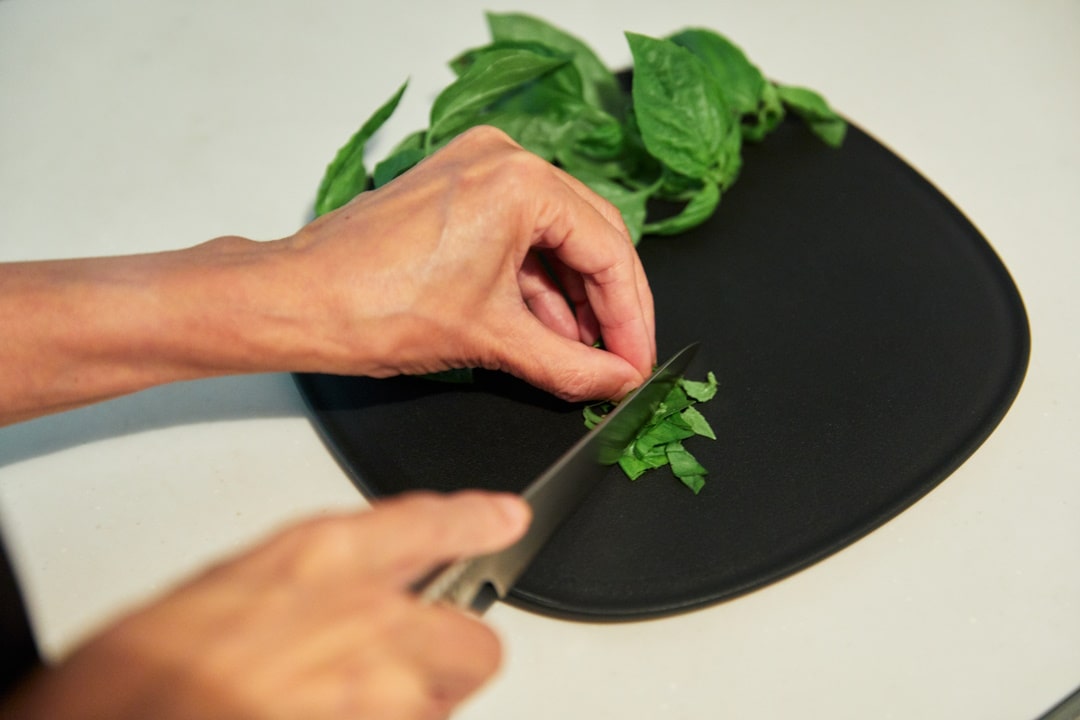 「まな板Sはちょっとしたタイミングで、さっと使えるのがいい。薬味を切るとか食材を置いておきたいとか、ほんのちょっとした時を助けてくれます。白いまな板は切り傷が黄ばんでしまうけど、ダークグレーで傷もつきにくい」