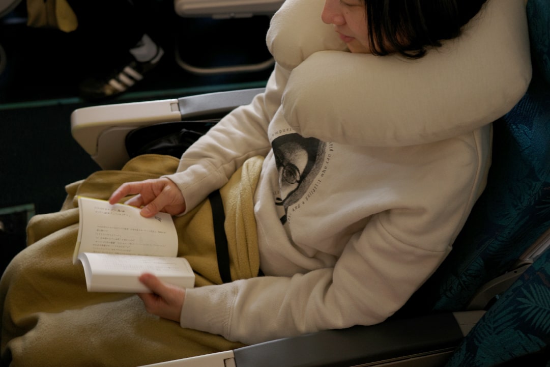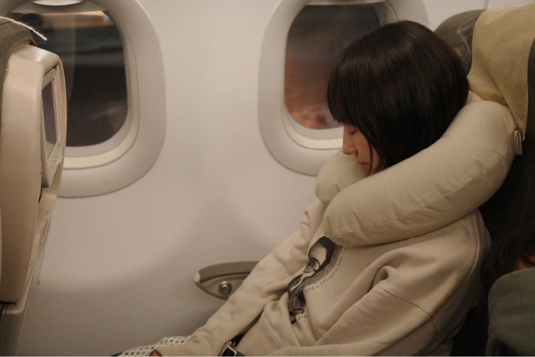 私も機内で膨らませて、首を包み込みます。肌触りもやさしく、頭が支えられて体に負担が少なく、機内でもぐっすり眠ることができました。