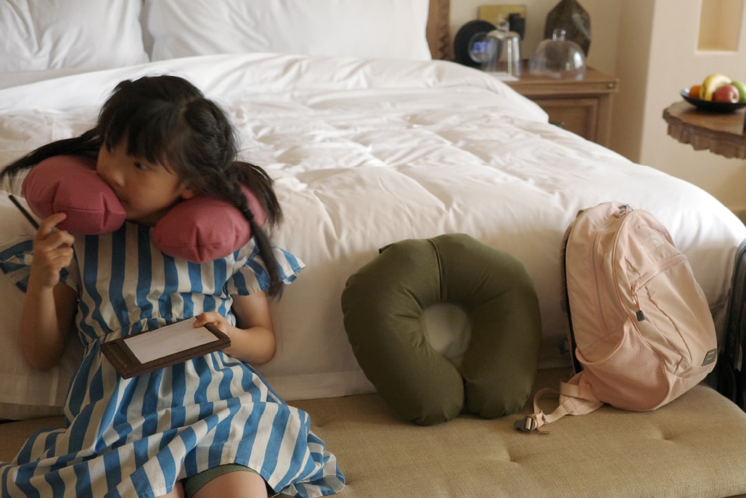 滞在先のホテルでも、気軽に膨らませて、クッション代わりに。ベッドで寝転んで読書をするときに、胸の下へ。娘のお昼寝の抱き枕に。書き物をするときの背もたれに、首の支えに。