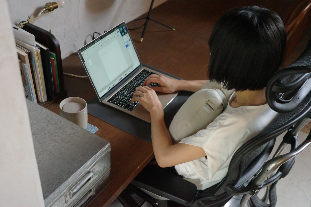 次の旅までしまっておくのはもったいなくて、自宅でのPC作業中に首につけたり、読書中にお腹に抱いたり。ちょっとした支えがあるだけで、体の負担は軽くなります。