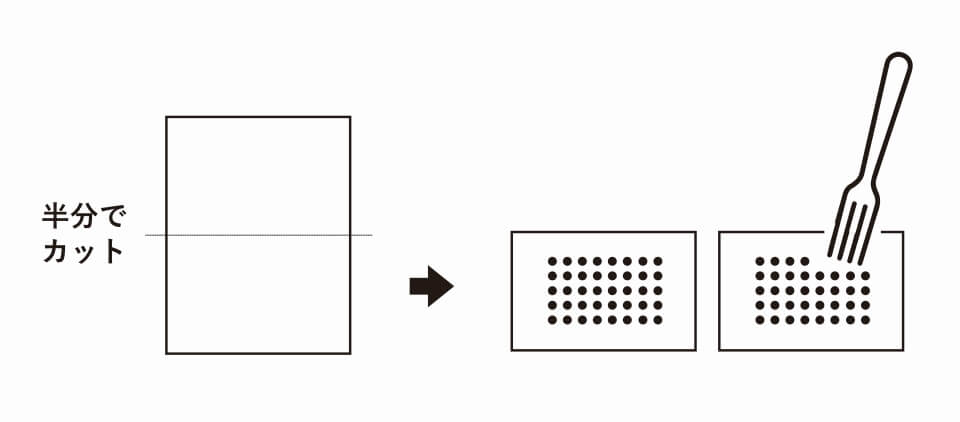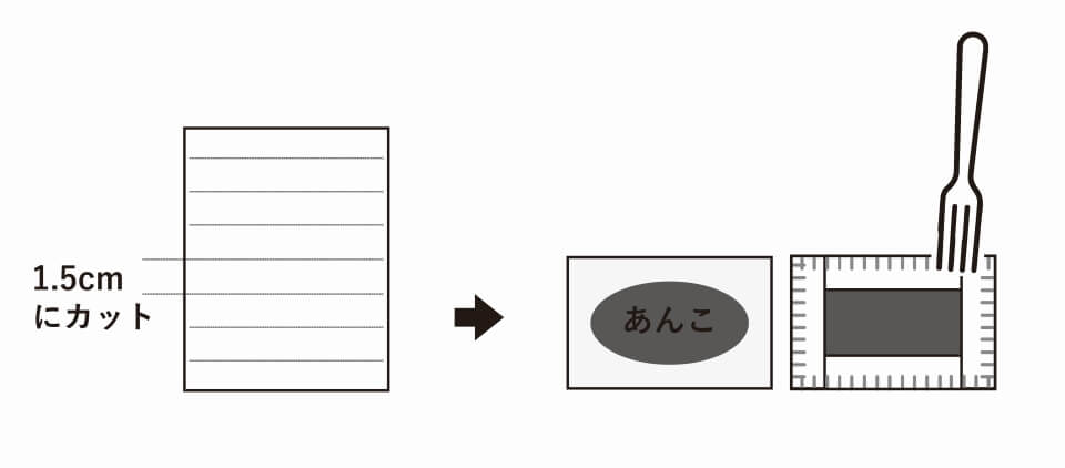 2.シートの1枚を下図のようにカットし、半分にカットしたシートの中央にフォークで穴を開け、その部分にあんこをのせ、周りに溶きほぐした卵黄を塗る。