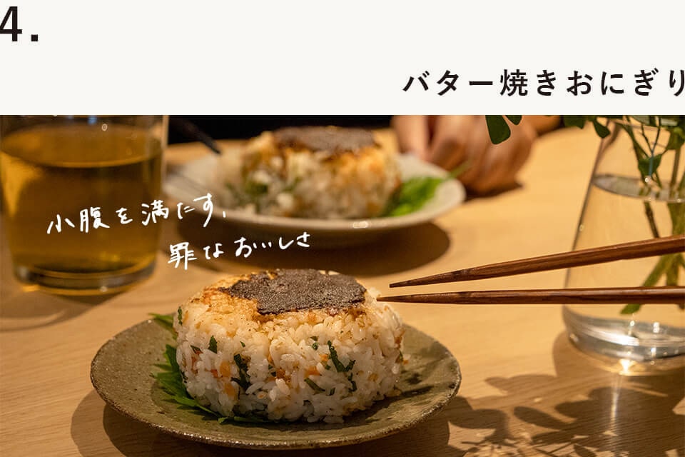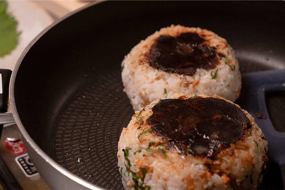 3.フライパンを中火で温め、バターを溶かし、みそがついていない面からおにぎりを焼く。
