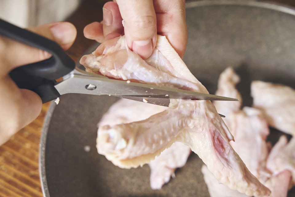 ①キッチンペーパーで手羽先の水気をとり、フライパンの上で、骨と骨の真ん中にハサミを入れて、先のとがった先端部分もカットし、3つのスティック状に切り分ける。そのままハサミを使って、ズッキーニは幅2cmほどの輪切りに、にんにくはざく切りに。