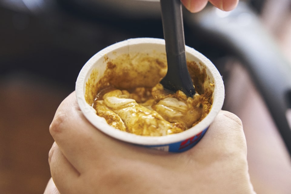 ③ヨーグルトカップの中でソースの材料を混ぜ合わせる。