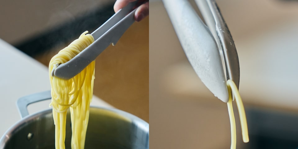 トングが果たすべき役割の一つは、菜箸では掴みにくいパスタなど麺類を掴むことですよね。目指したのは重たい鍋を流しまで持っていかなくても、トング1本で湯切りが完了すること。