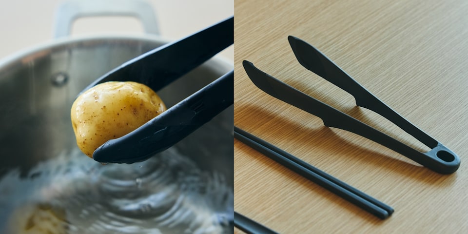 じゃがいもなど大きな食材を掴むときも、内側の凹凸で滑り落ちない設計に。調理中に一時置きができるように、柄には先端を浮かせる突起をつけました。