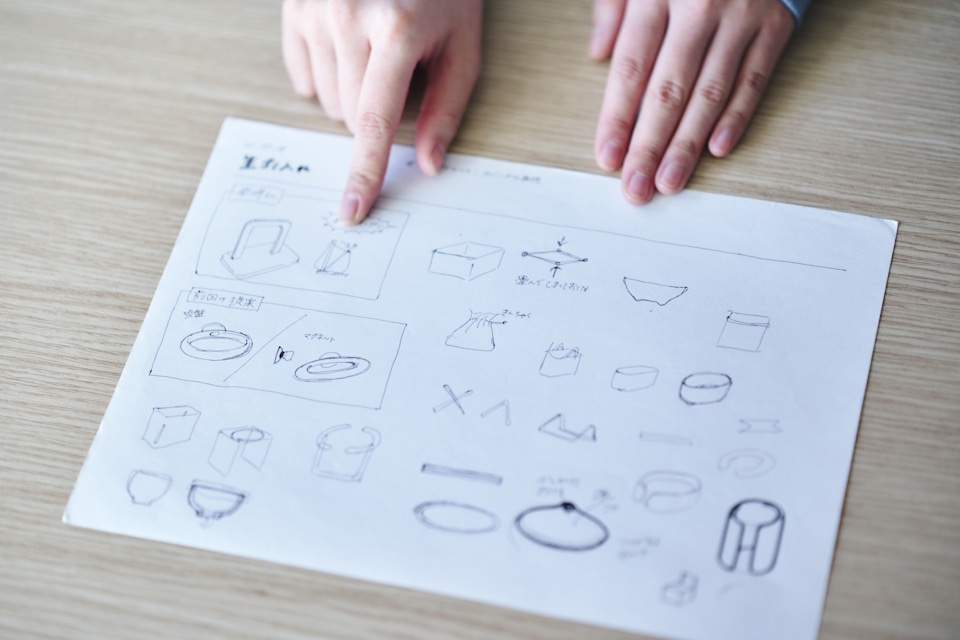 まず、生ゴミ入れのターゲットは?使用シーンは?コンセプトは?と、派生するキーワードを紙にどんどん書き出していきました。その過程で、シンクで使うのが当たり前だと思っていたけど、そうじゃないのかもと。