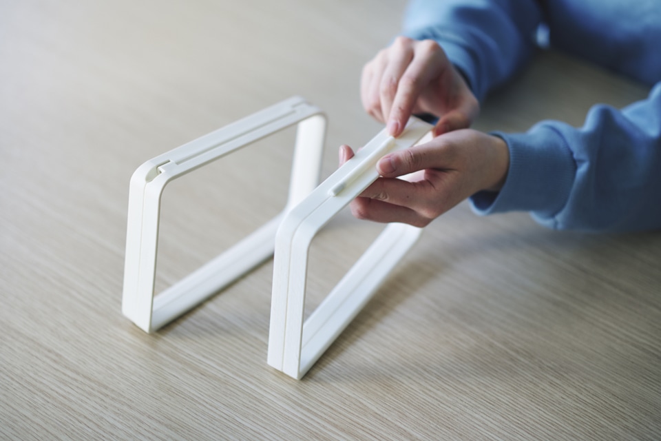 滑り止めは、樹脂製にしたことでフレームと一体化させることができました。凹凸や溝がない分、汚れにくく、洗いやすくなっています。