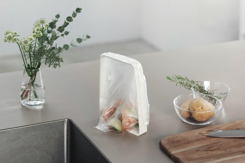 中には、生ゴミ入れ以外の使い方をしてくれる方もいるんです。計量スケールの横にポリ袋ホルダーを置き、かけた袋だけがスケールに乗るようにセットして、食材を計量している方もいて驚きました。食材の下ごしらえや保存袋への移し替えなどにも使っていただけます。