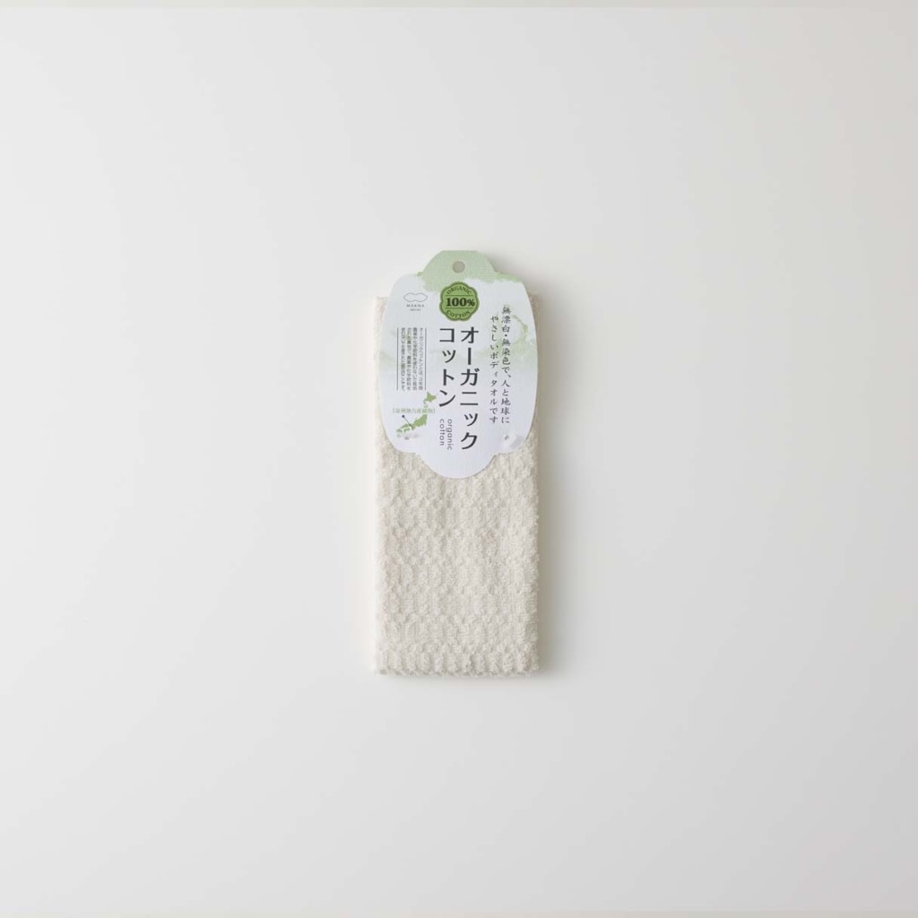 古くからの織物産地である泉州地方で、丁寧に織り上げました。無漂白・無染色で人と地球にやさしいオーガニックコットン100%のボディタオルです。