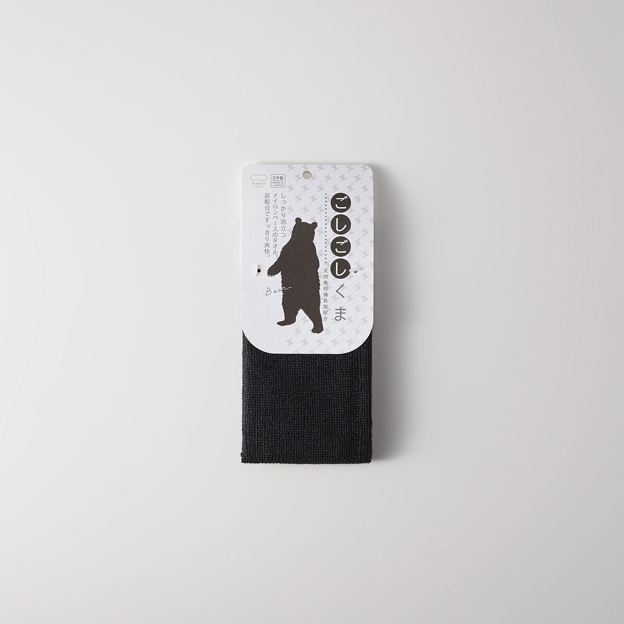 しっかり泡立つナイロンベースのタオルです。炭配合ですっきり爽快。天然素材備長炭配合です。