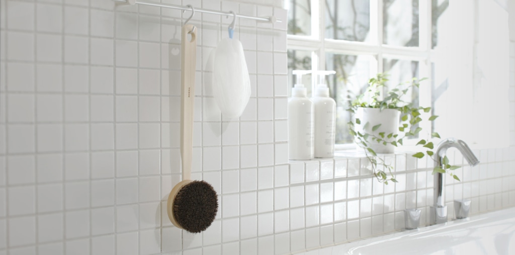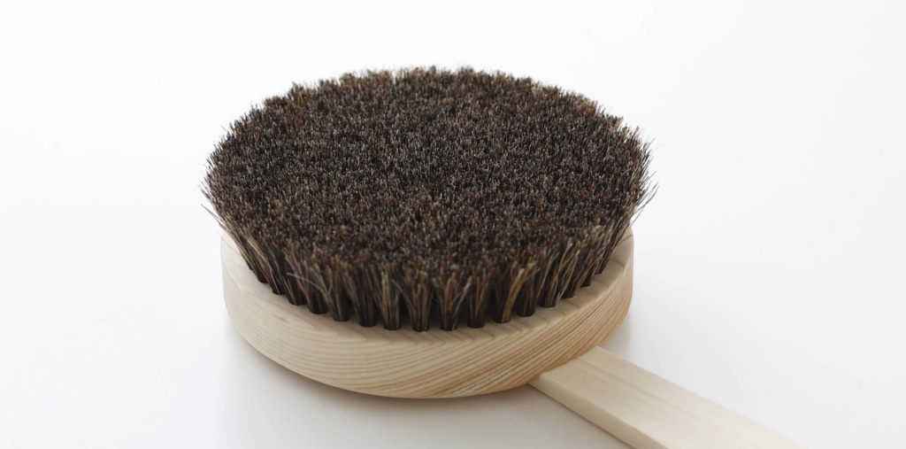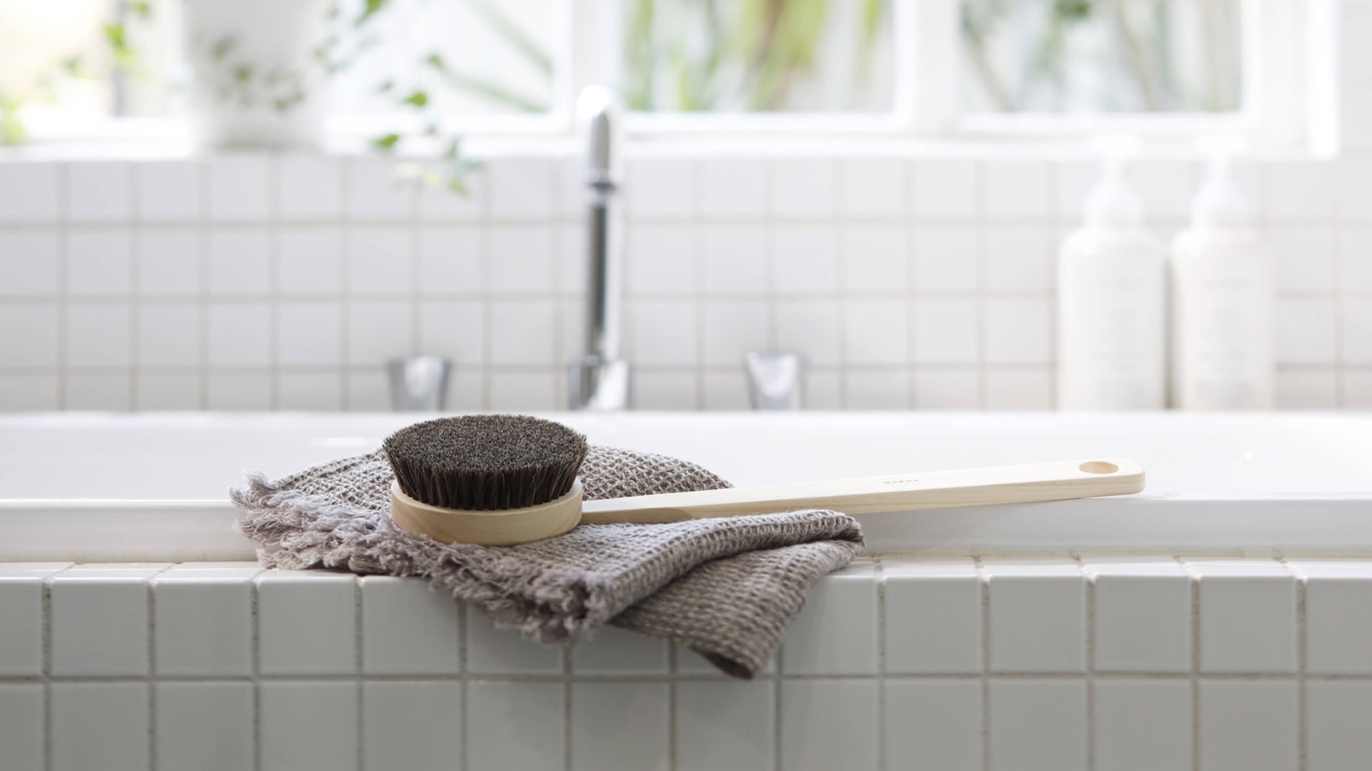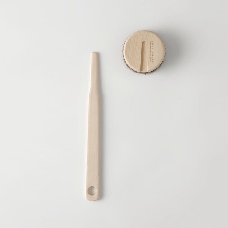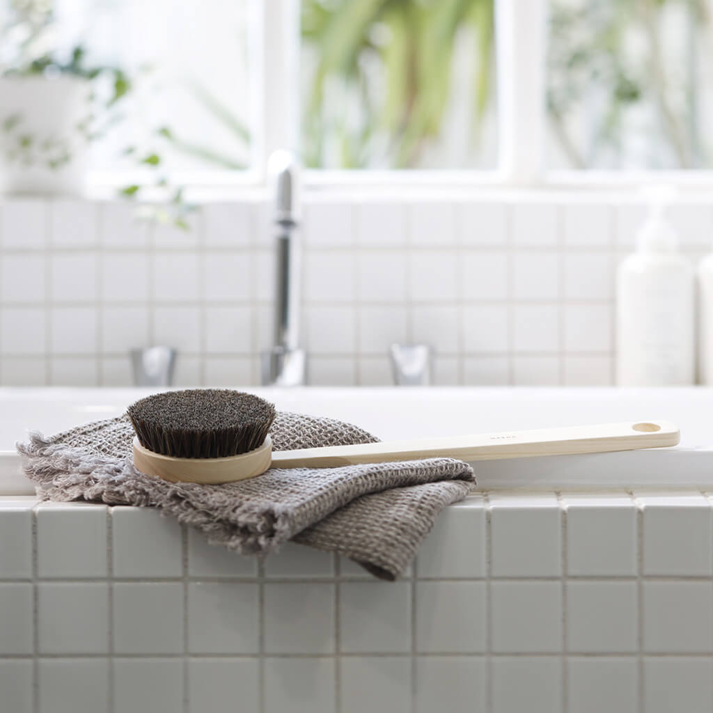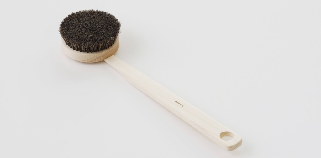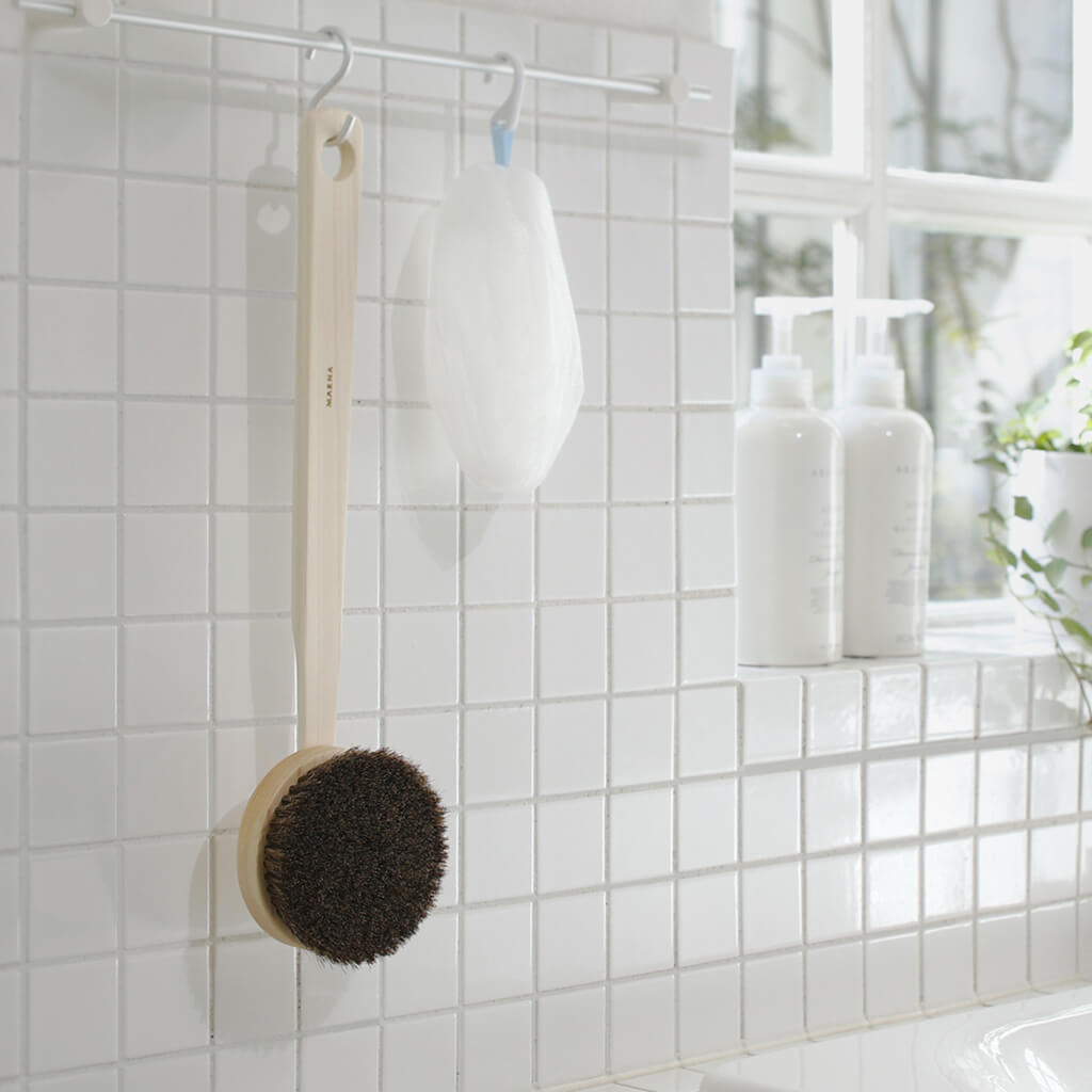 天然素材のボディブラシです。ブラシ部分には柔らかい洗い心地の馬毛を使用しています。柄には国産ひのきを採用。取り外すとハンドブラシとしても使用できます。