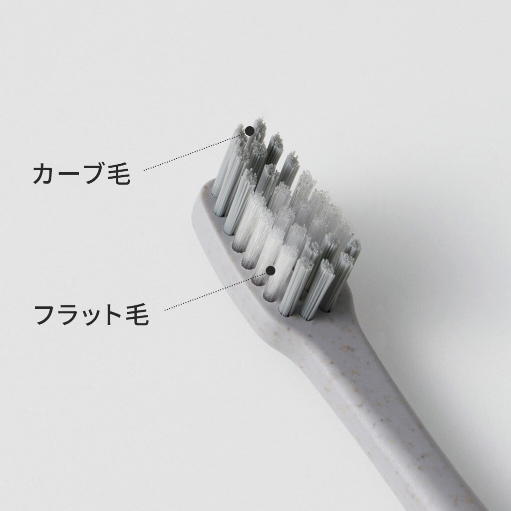 「カーブ毛」が奥歯の裏側まで届いて歯垢を落とし、「フラット毛」が歯の表面やくぼみに沿い、ツルツルに磨きあげます。