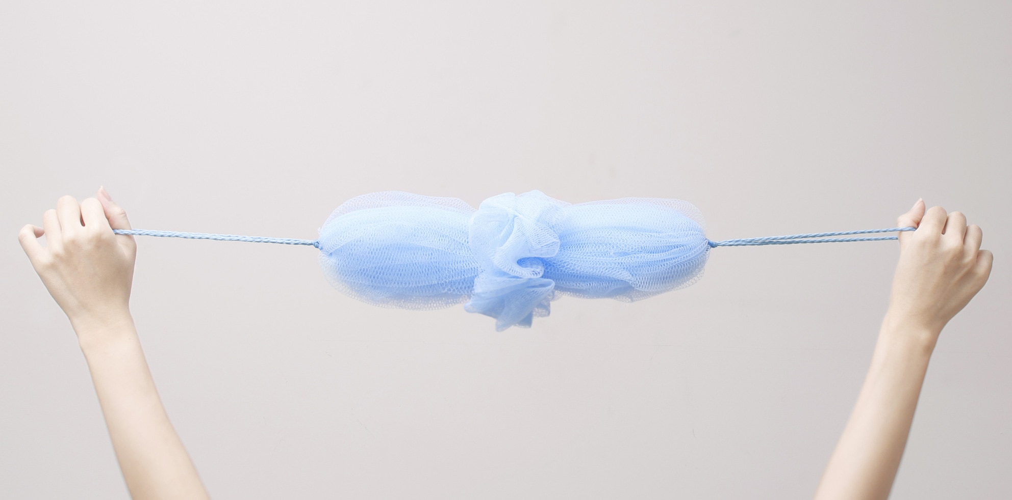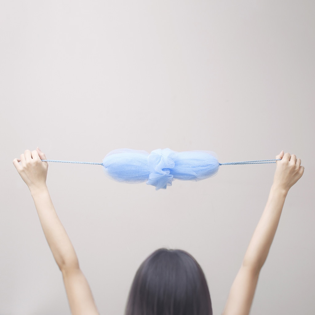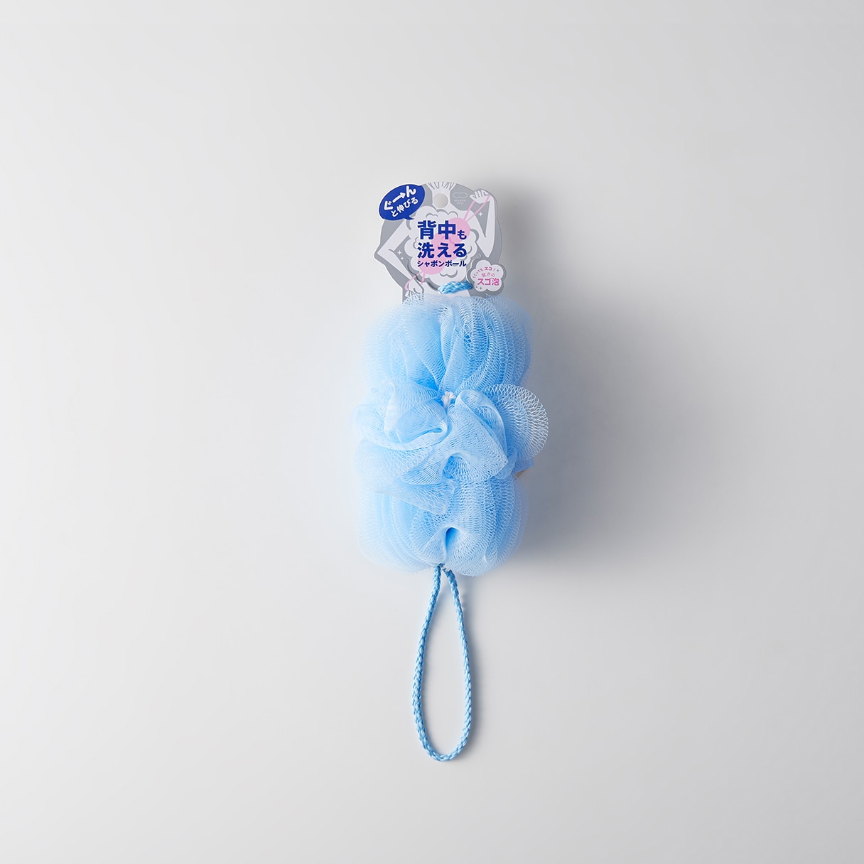 少ない石けんでたっぷり泡立つ、体洗い用のシャボンボールです。両端のひもを引っ張るとネットの部分がぐーんと伸びて、手が届きにくい背中も楽に洗えます。