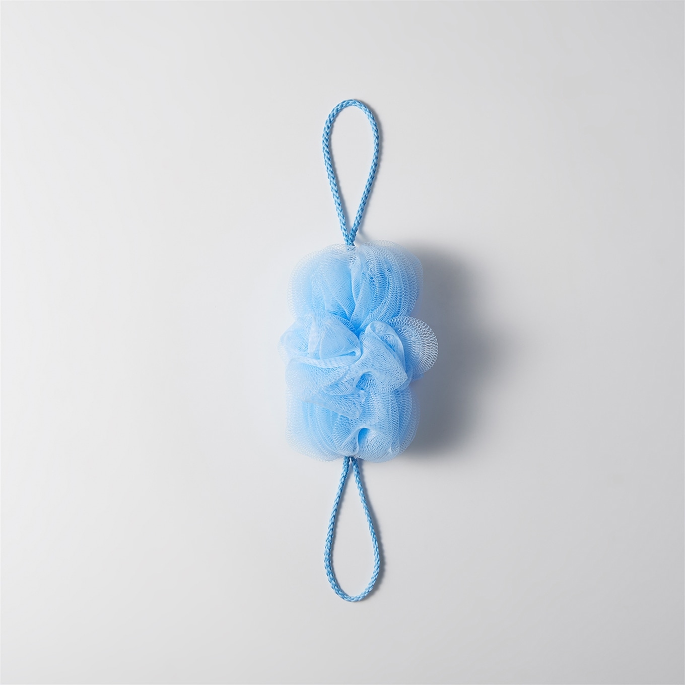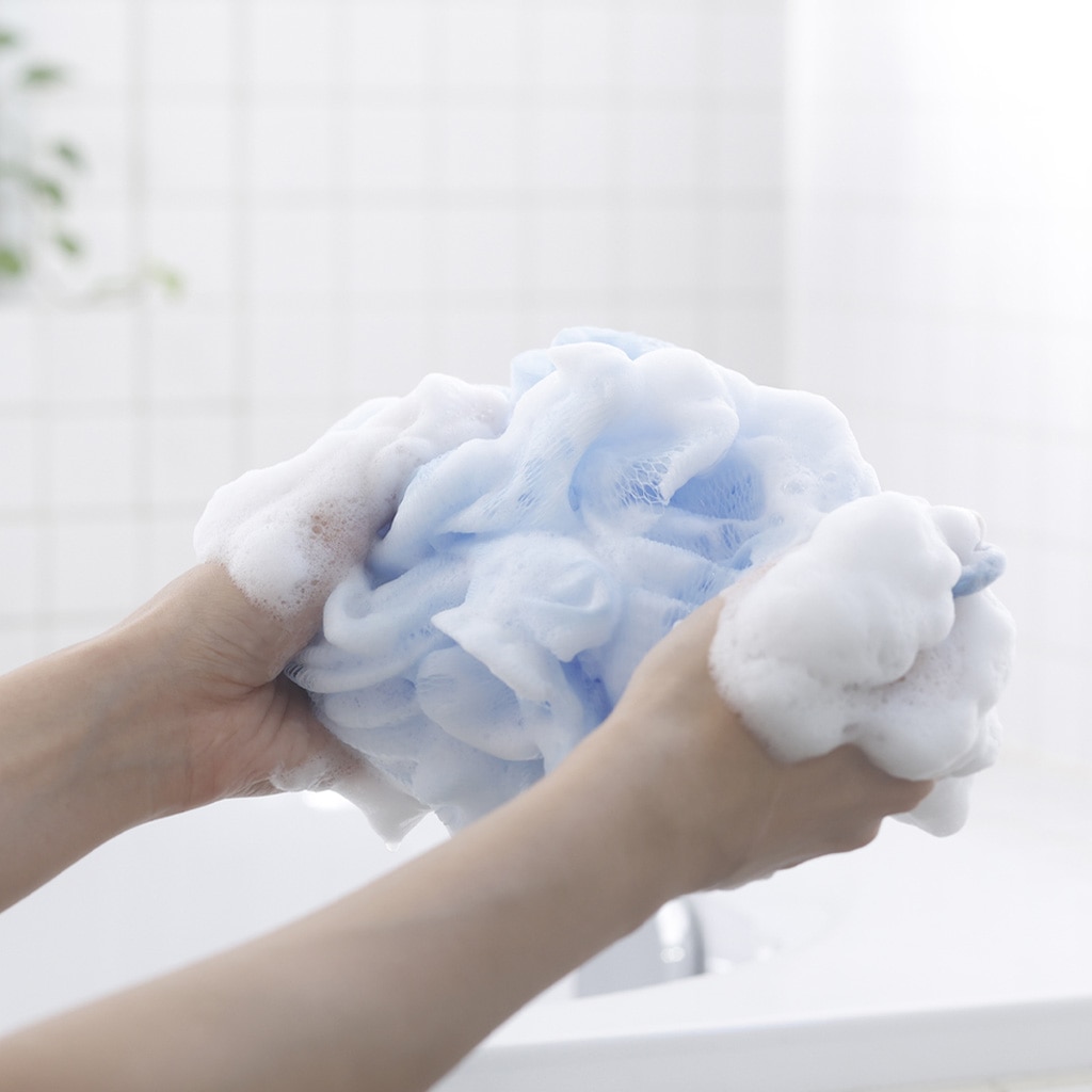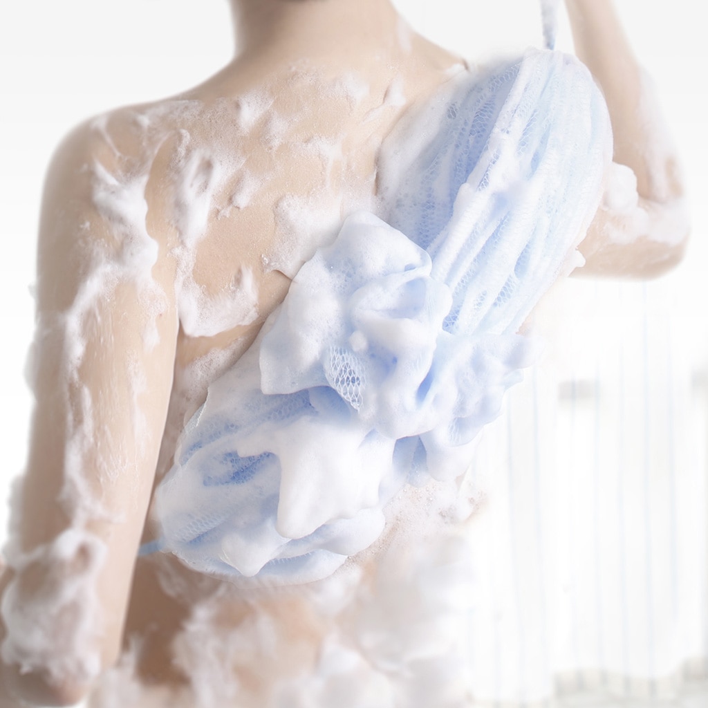 少ない石けんでたっぷり泡立つ、体洗い用のシャボンボールです。両端のひもを引っ張るとネットの部分がぐーんと伸びて、手が届きにくい背中も楽に洗えます。