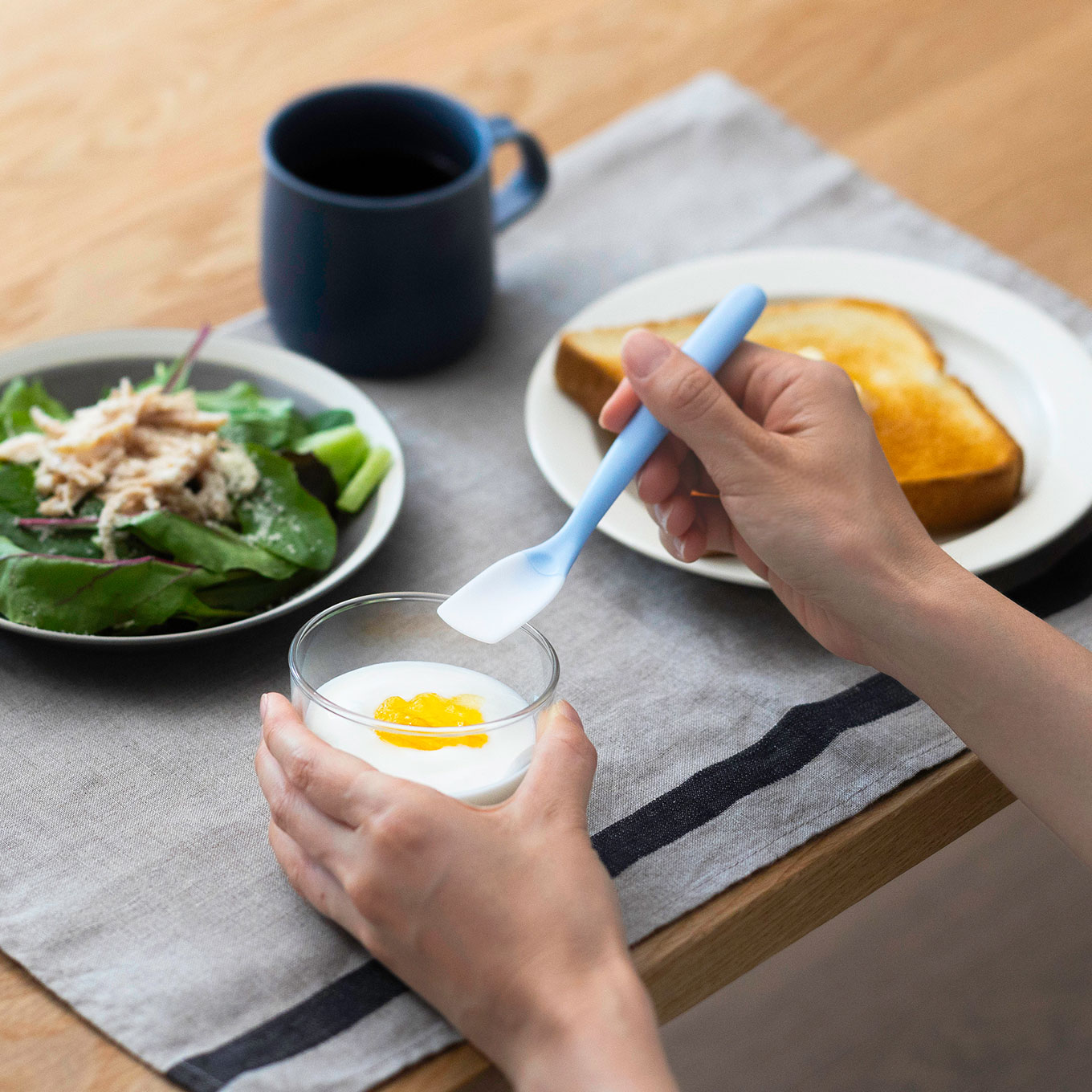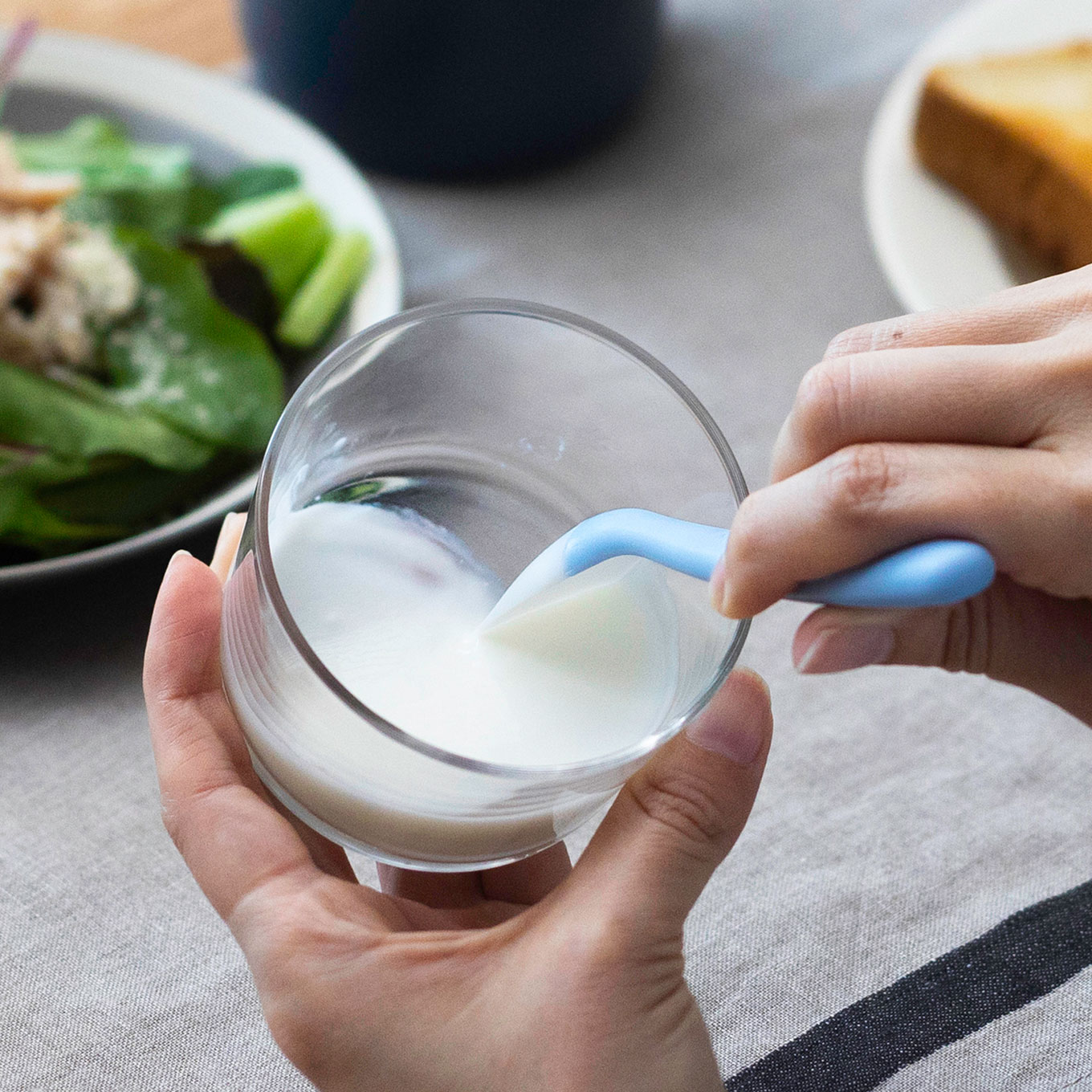 ヨーグルトを食べるのにピッタリのスプーンです。カップのスミと内側にぴったりフィットする形状。先端がやわらかいのでヨーグルトを残さず取りきれます。口当たりが優しく食べやすい柄の角度でスムーズに食べられます。