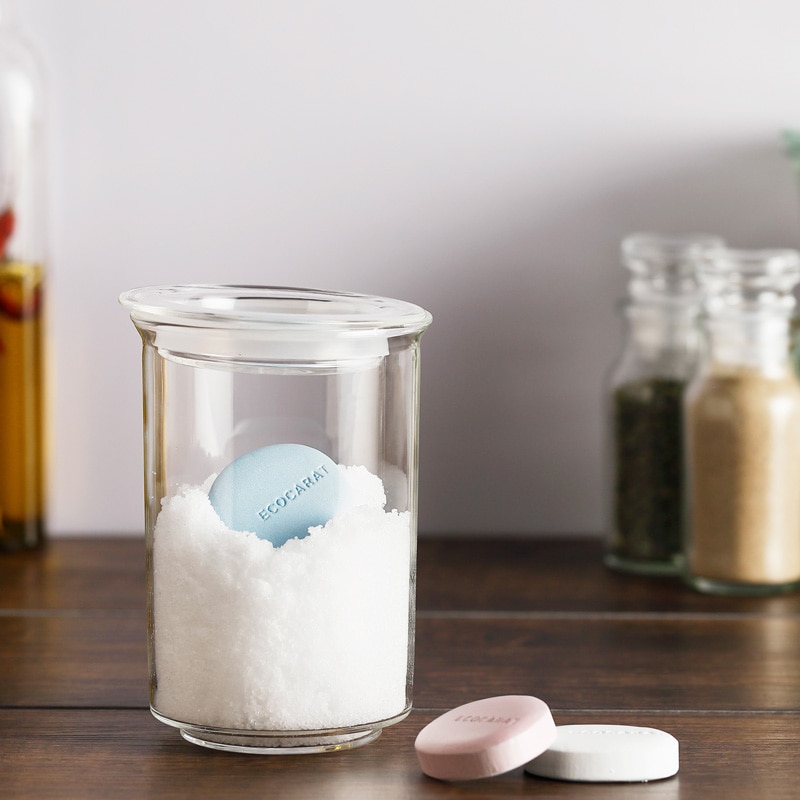 ●塩は湿度が高いと固まる → エコカラットの吸湿力でさらさらに。