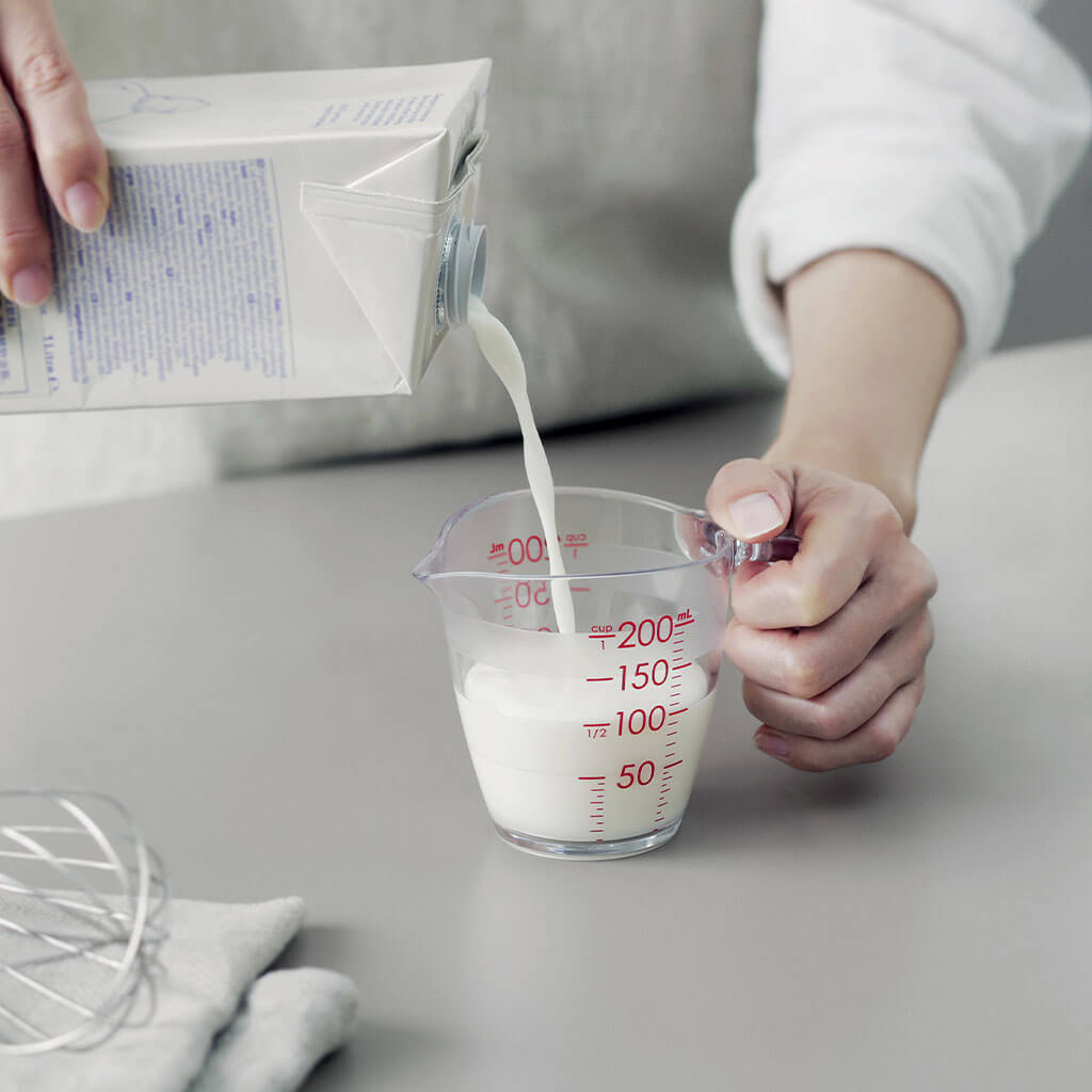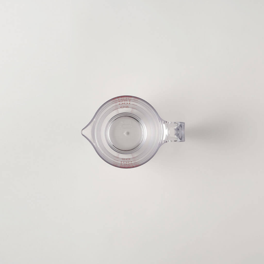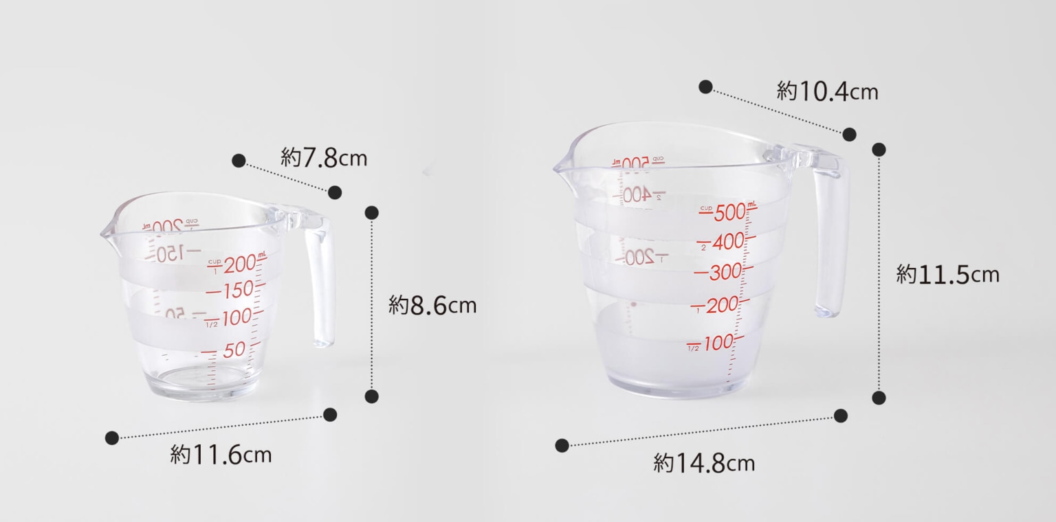 大きな数字と全周にわたるボーダーの計量線で、どこからでも目盛りが見えて量りやすい計量カップです。注ぎ口は先端が薄く、注ぎやすく液だれしにくい形状。内側に角がないので洗いやすく、逆さにしたときに注ぎ口が台に触れないので、乾きやすく衛生的です。
