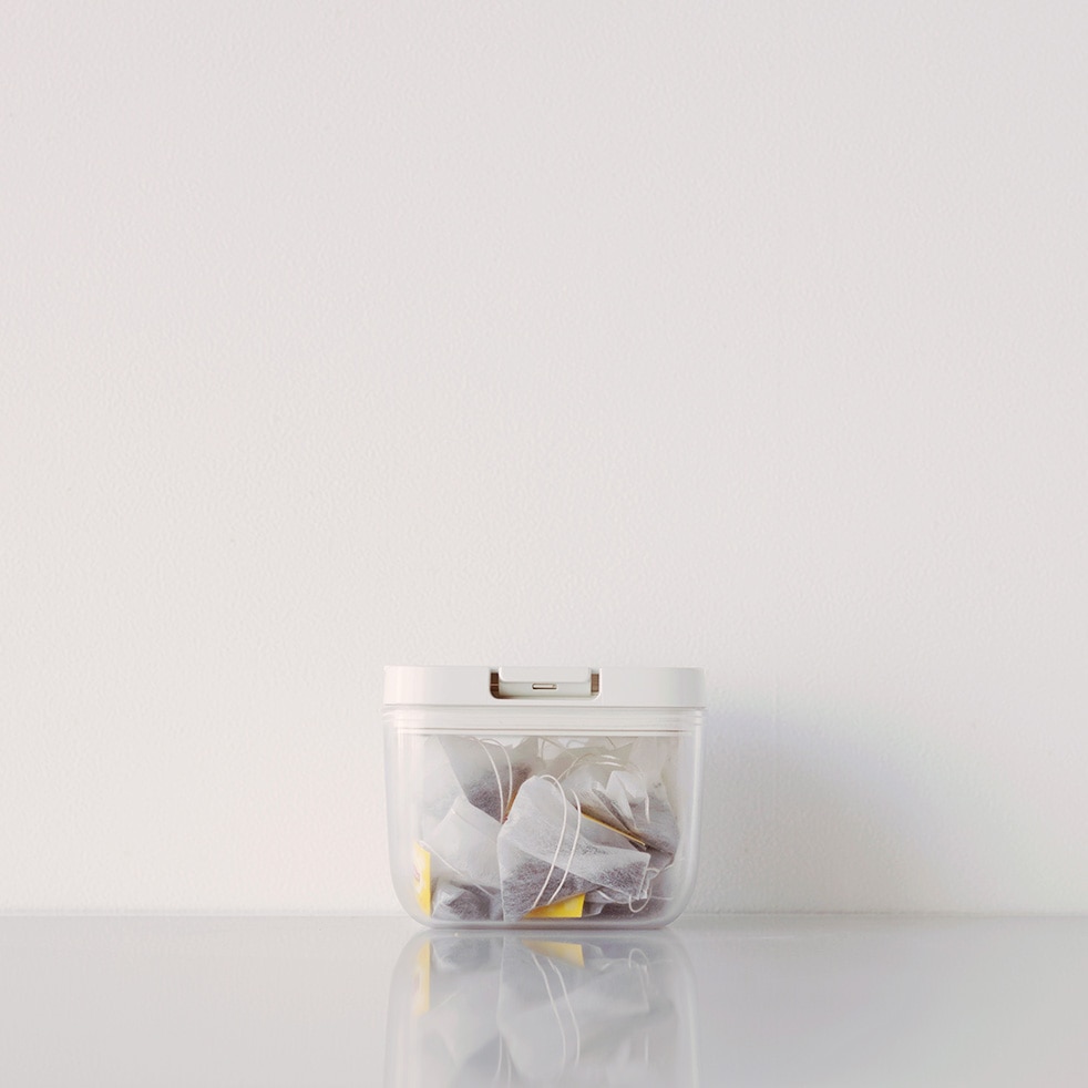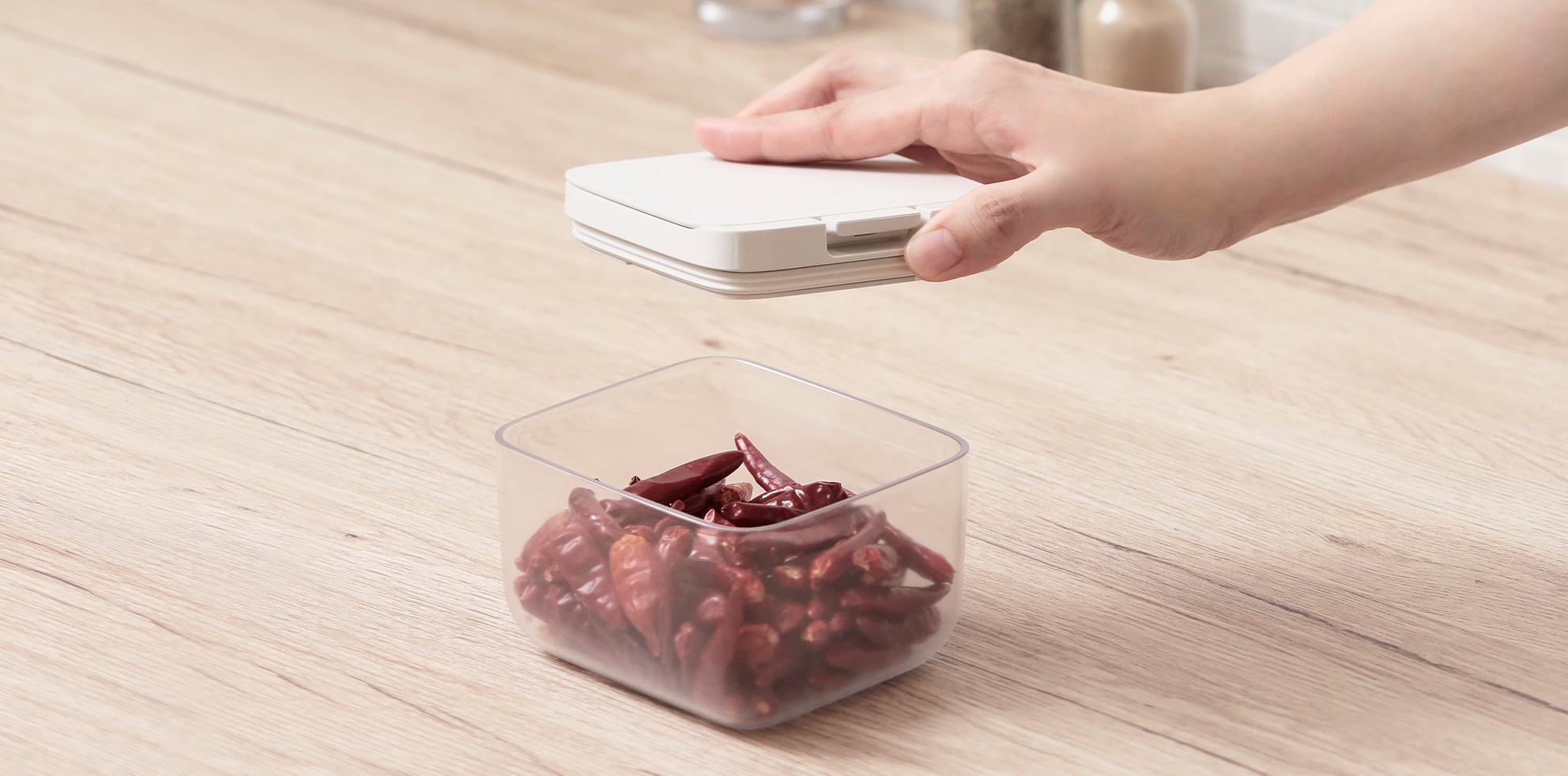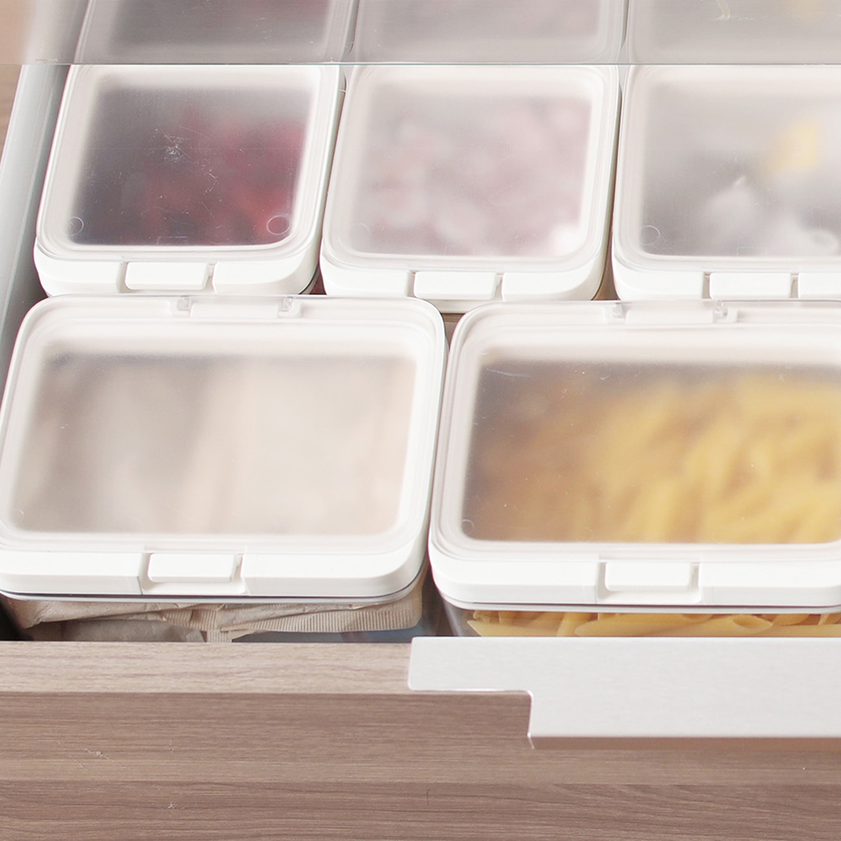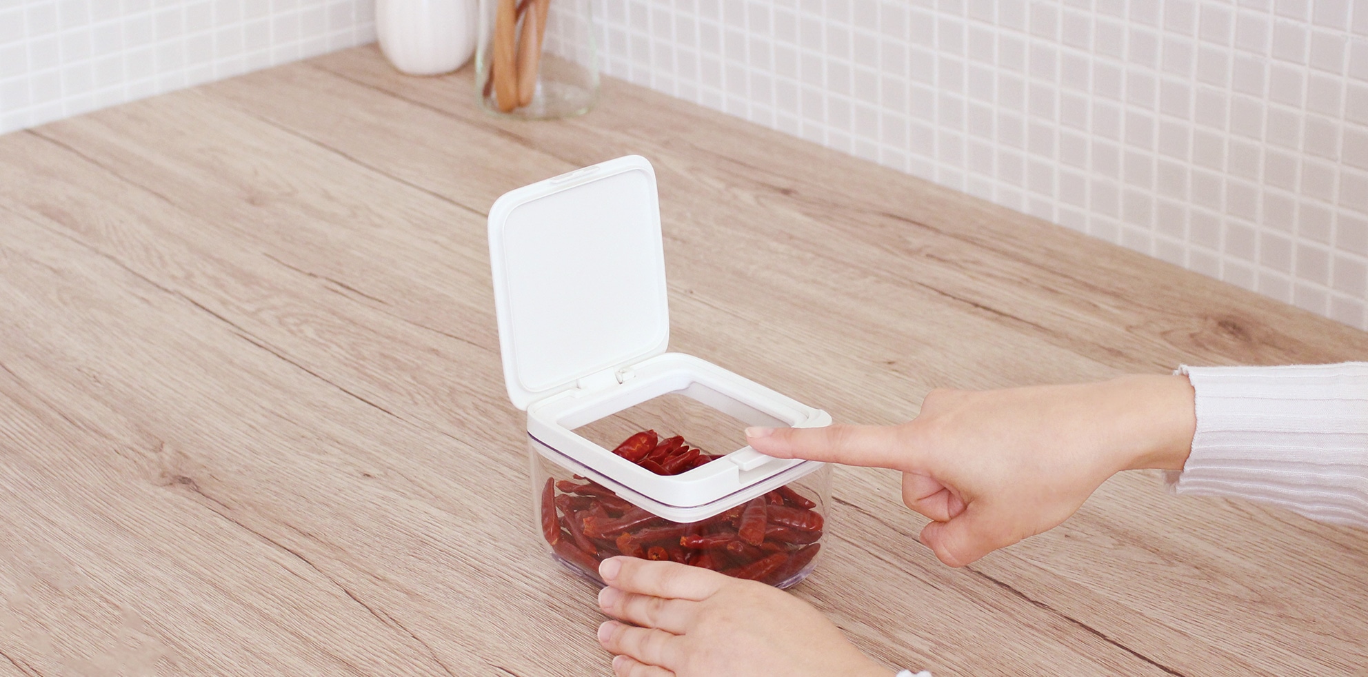 パッキンでしっかり閉まって湿気・乾燥を防ぎ、ワンタッチで開くコンテナシリーズ