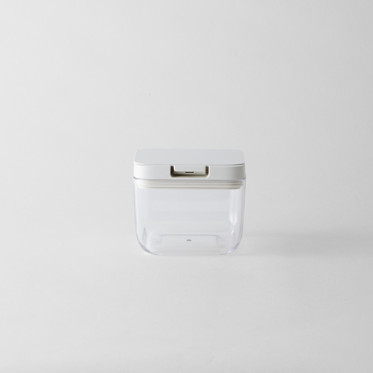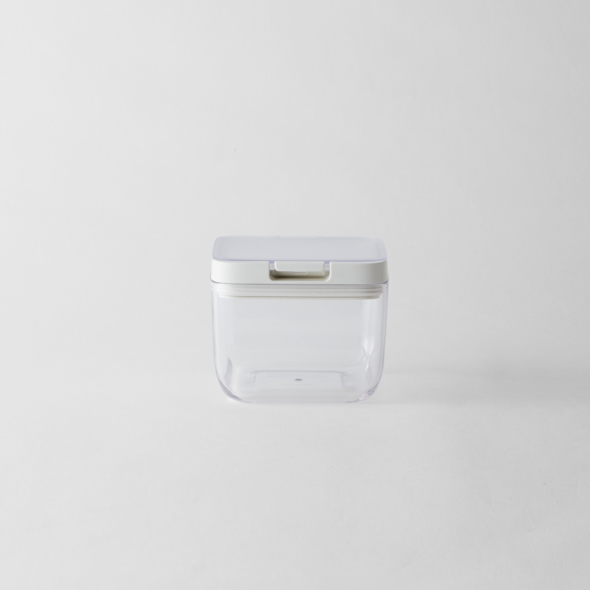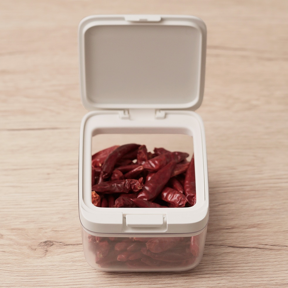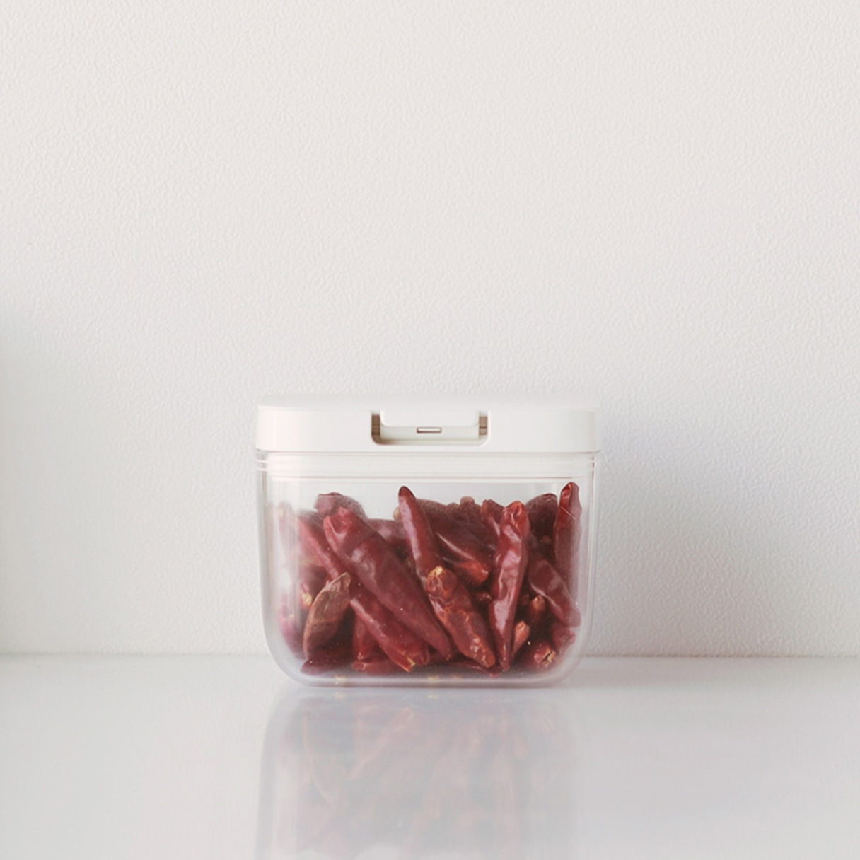 パッキンでしっかり閉まって湿気を防ぎ、ワンタッチで開く保存容器。鷹の爪など少量の乾物やスパイス入れに丁度いいサイズです。