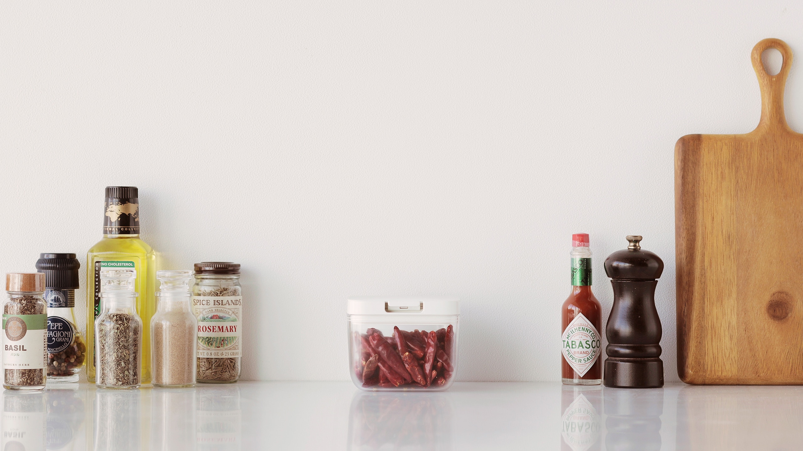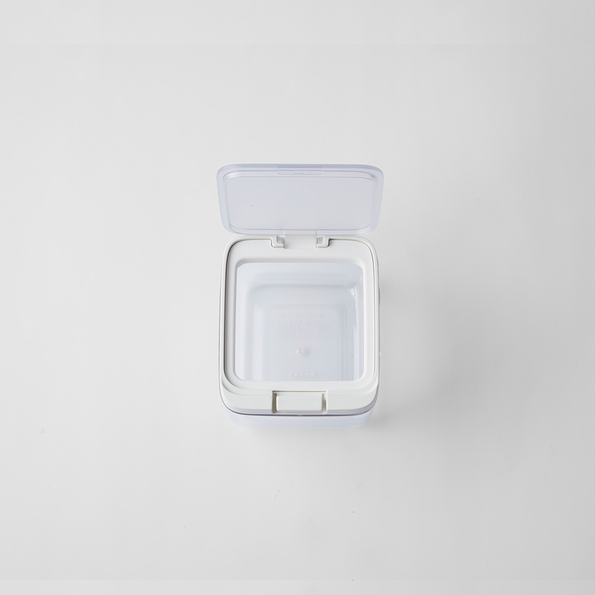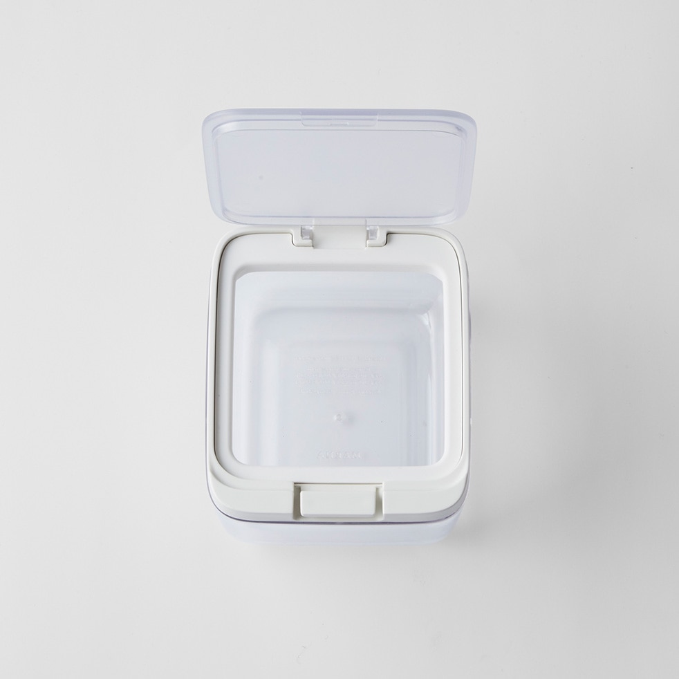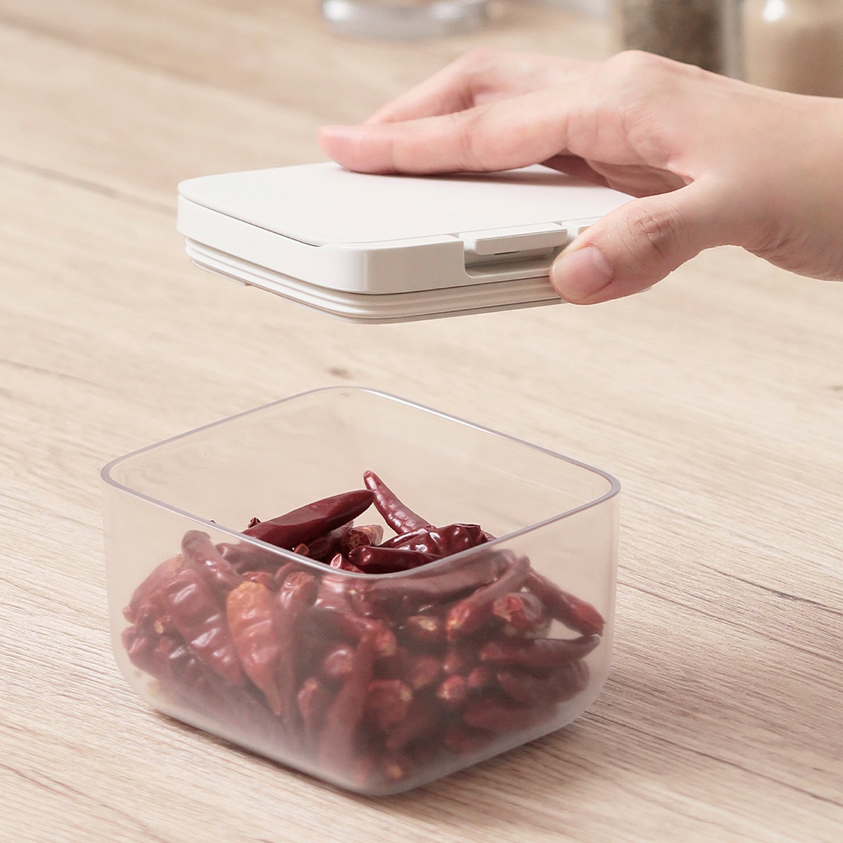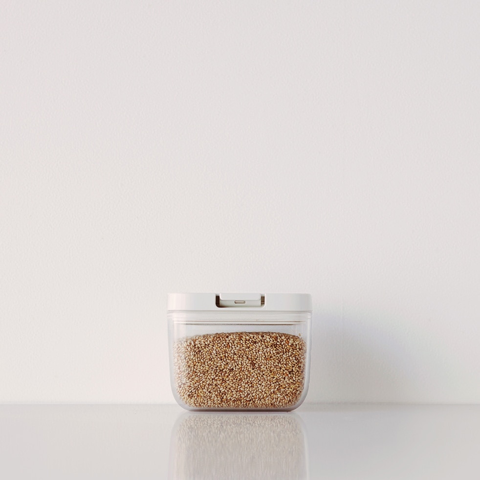 パッキンでしっかり閉まって湿気を防ぎ、ワンタッチで開く保存容器。鷹の爪など少量の乾物やスパイス入れに丁度いいサイズです。