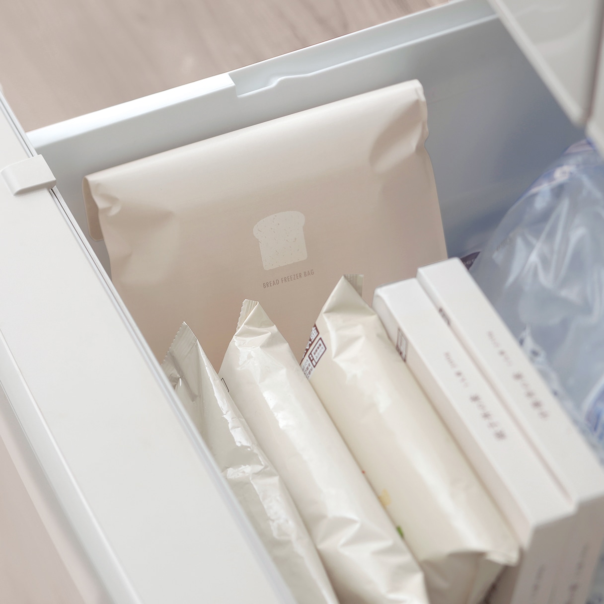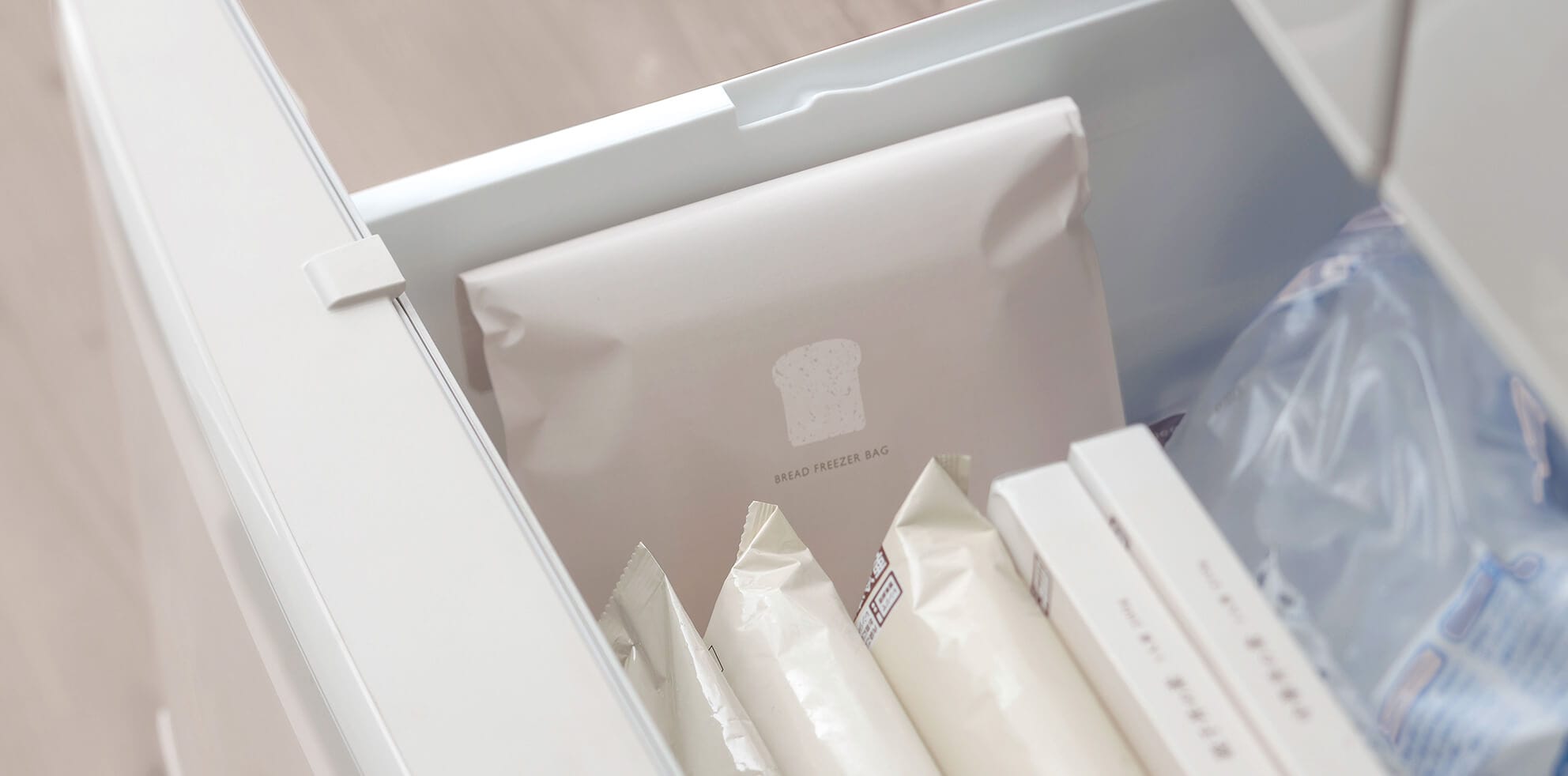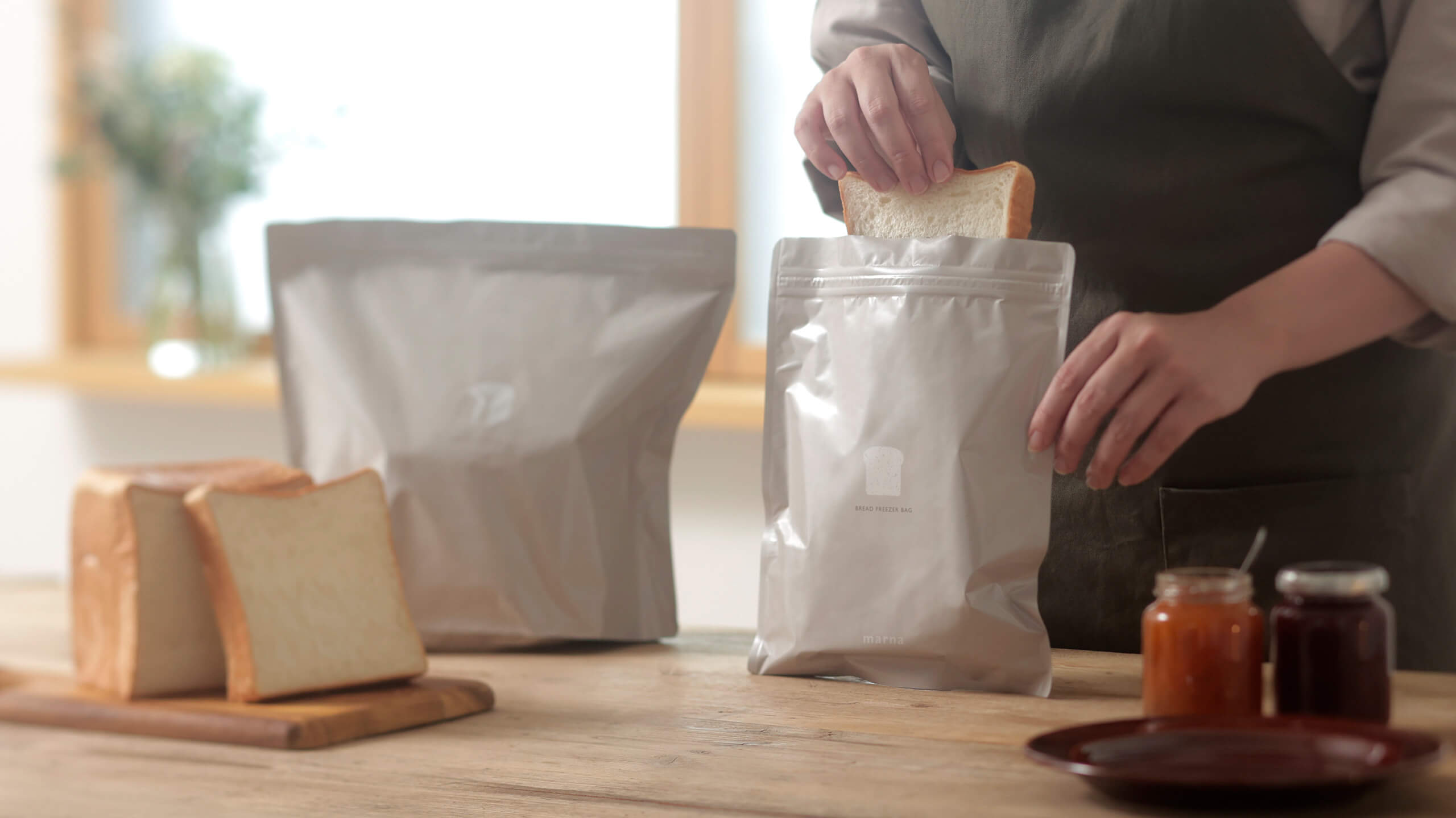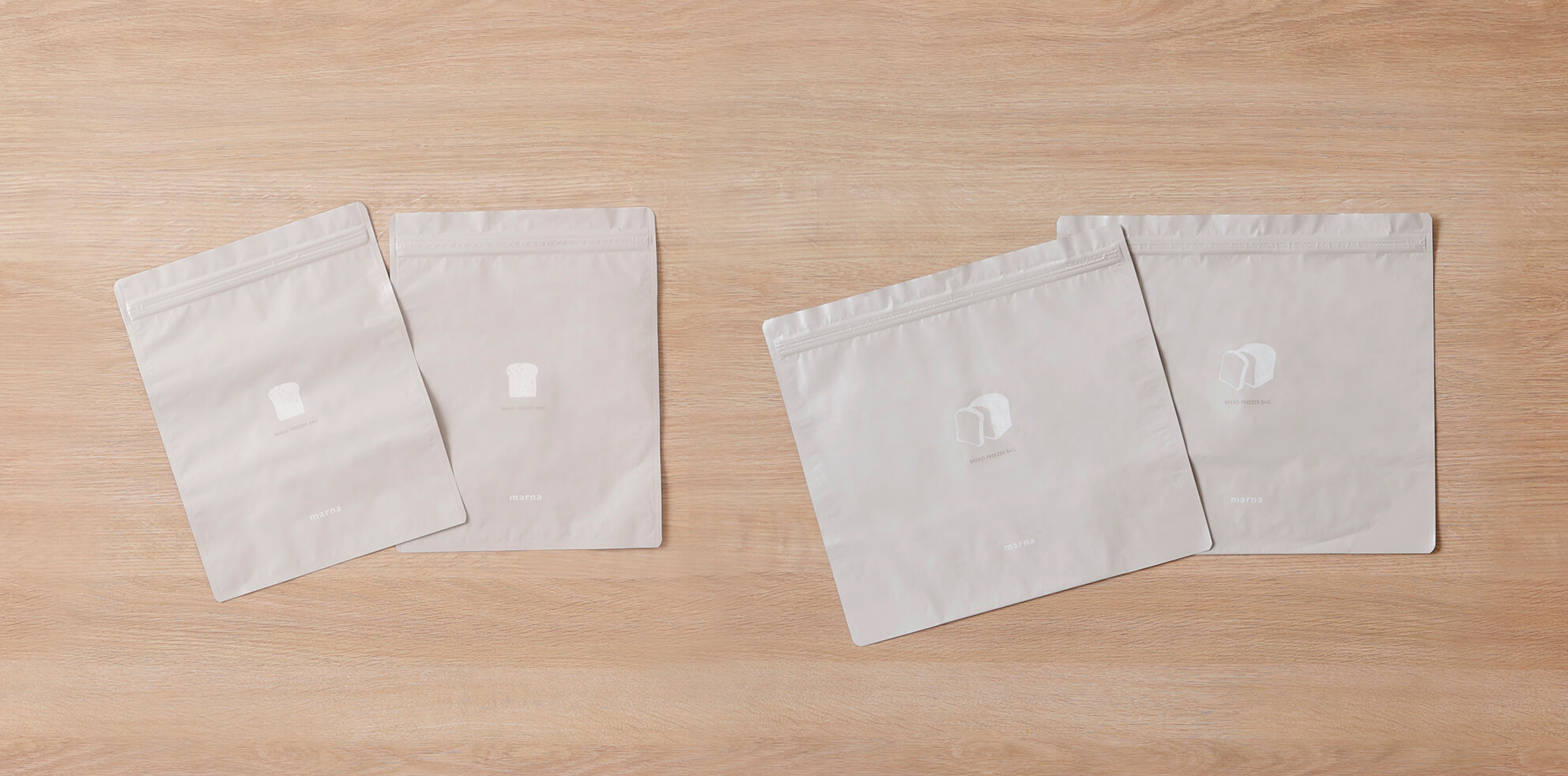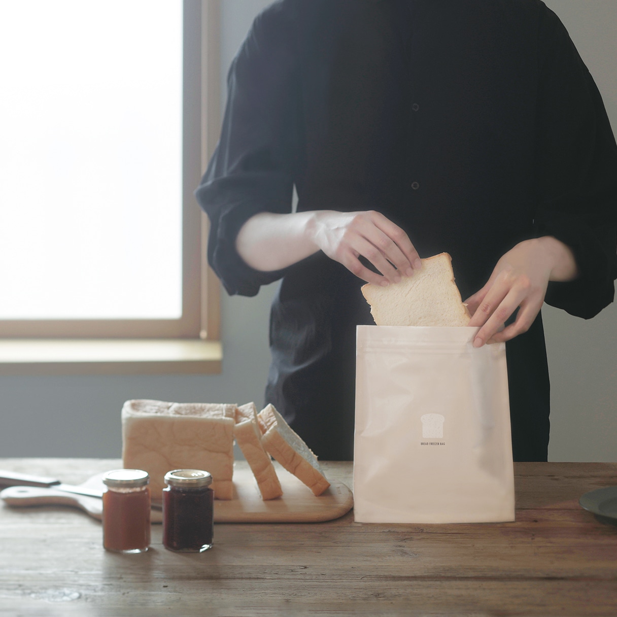 パンのおいしさを保ったまま冷凍できる保存袋です。創業1974年の歴史あるパン・料理教室「ホームメイドクッキング」共同企画。アルミを挟んだ三層構造で冷凍時の臭い移りや乾燥を防ぎます。