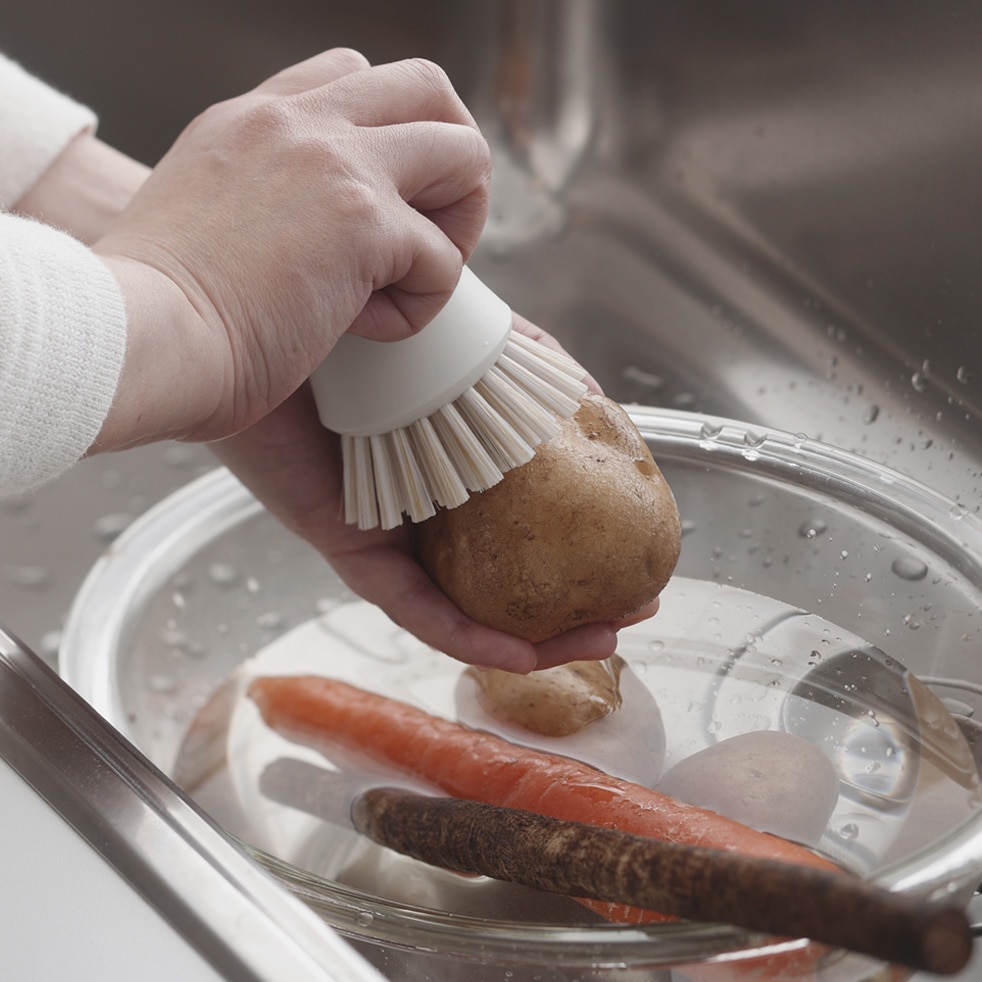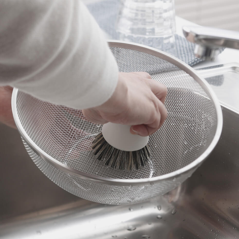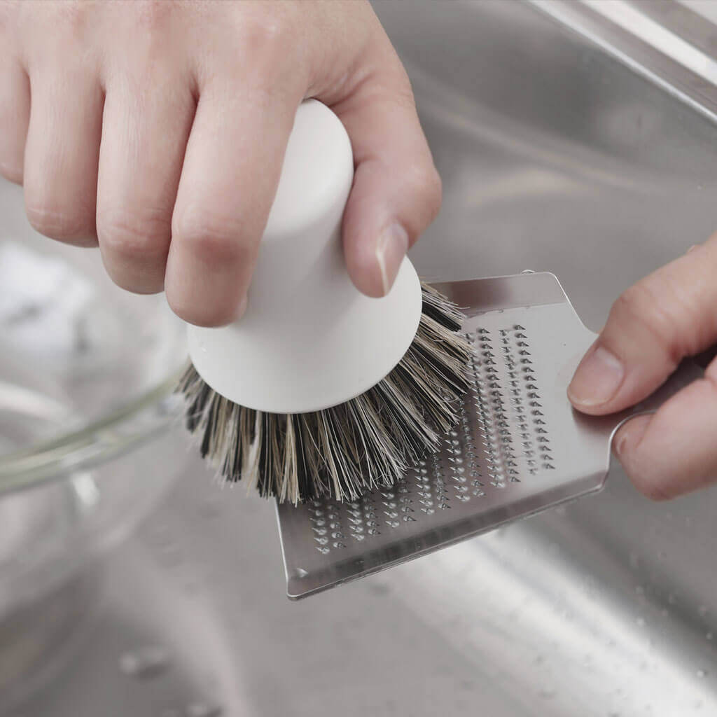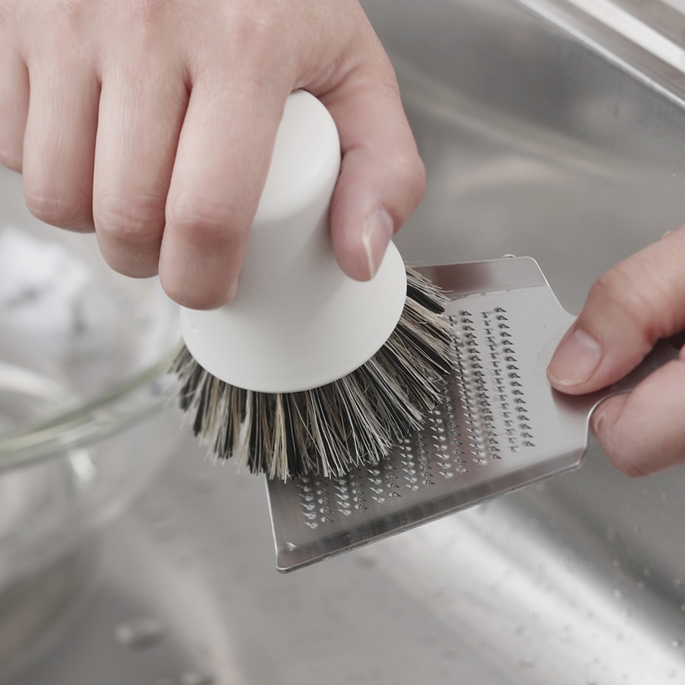 汚れをかき出しながら落とす「かため」タイプ。豚毛と太いナイロン毛の混毛で、しっかりとしたコシのある洗い心地です。おろし金など、スポンジでは難しい洗いものにもおすすめです。