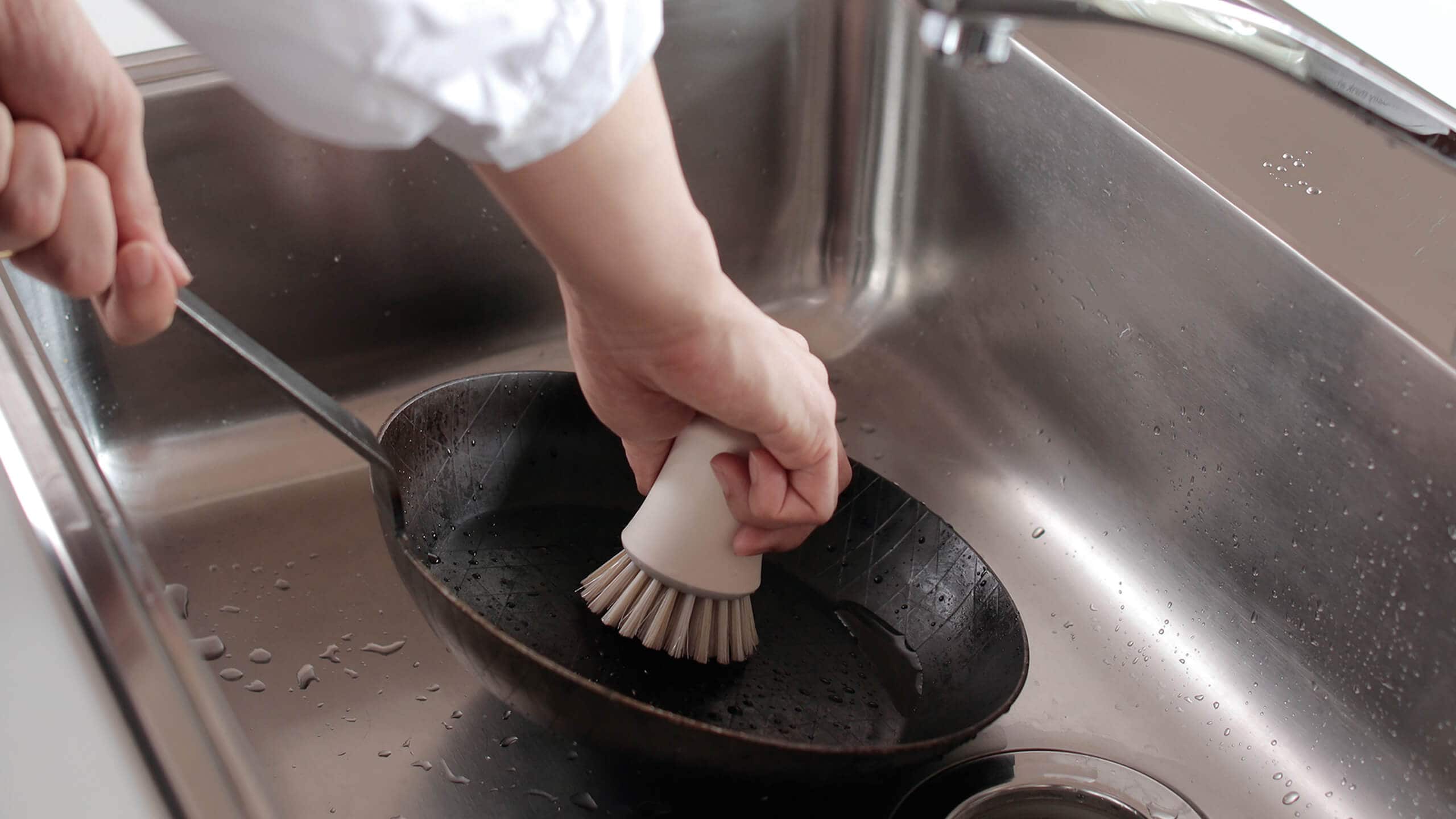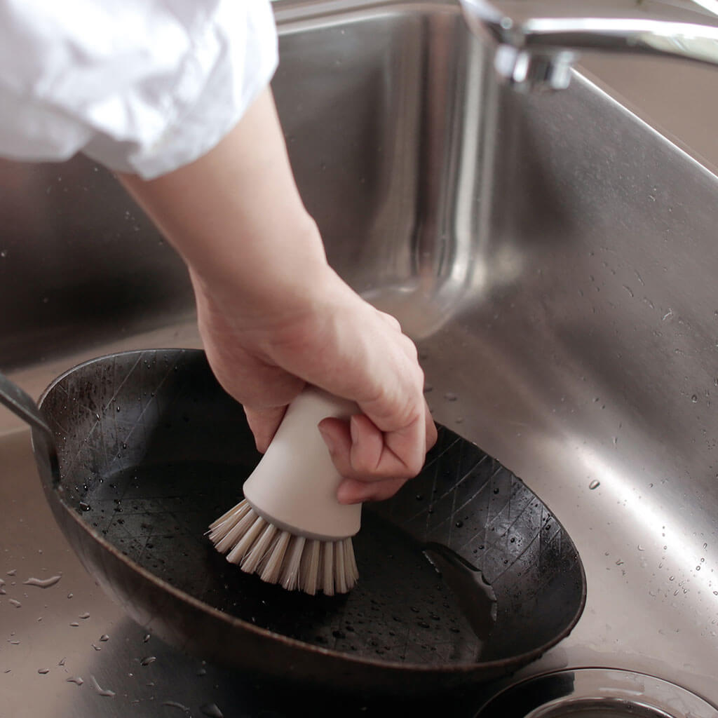 フライパンやザルが洗いやすい、抗菌剤入りで清潔に使えるキッチンブラシです。
