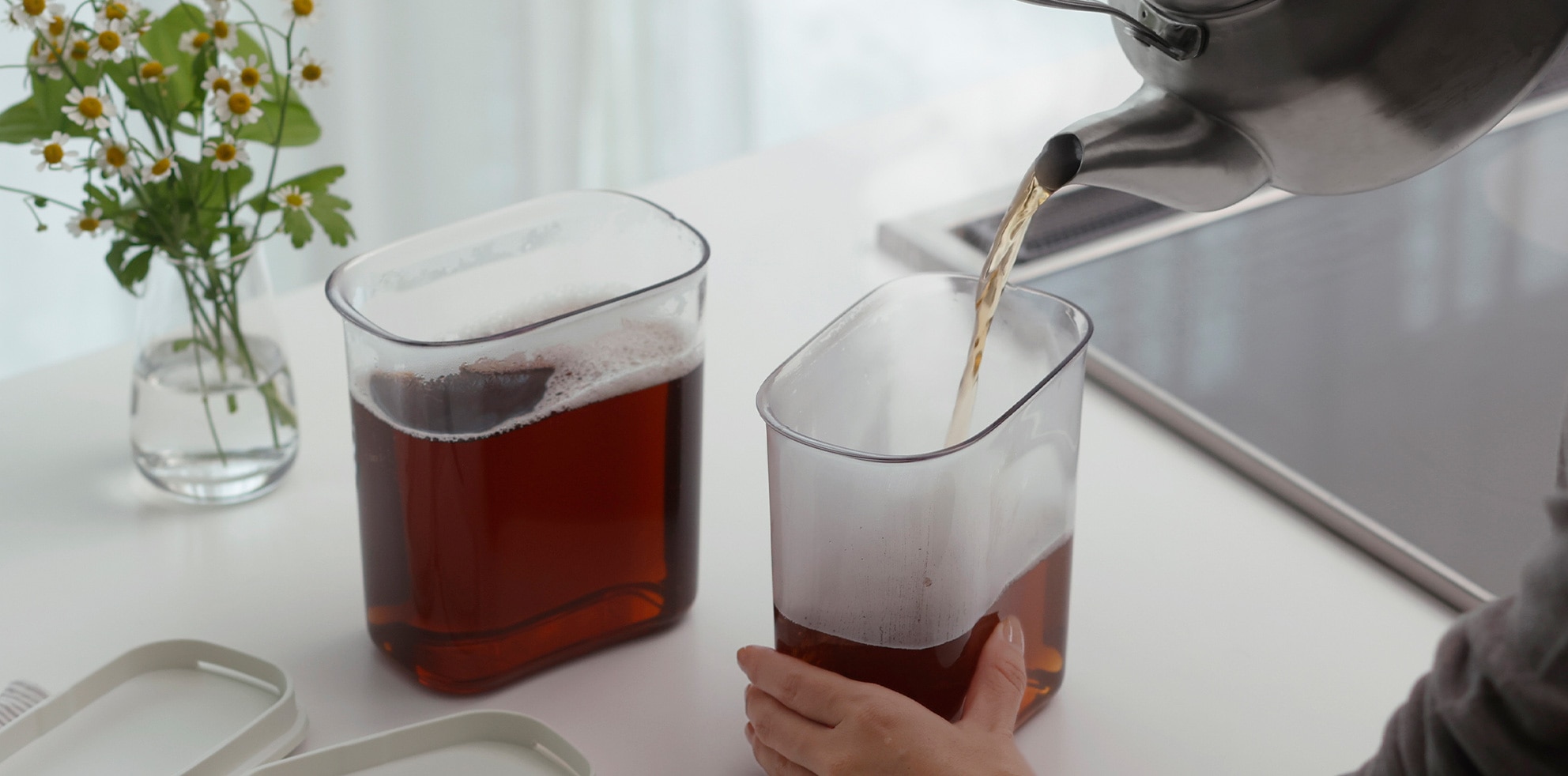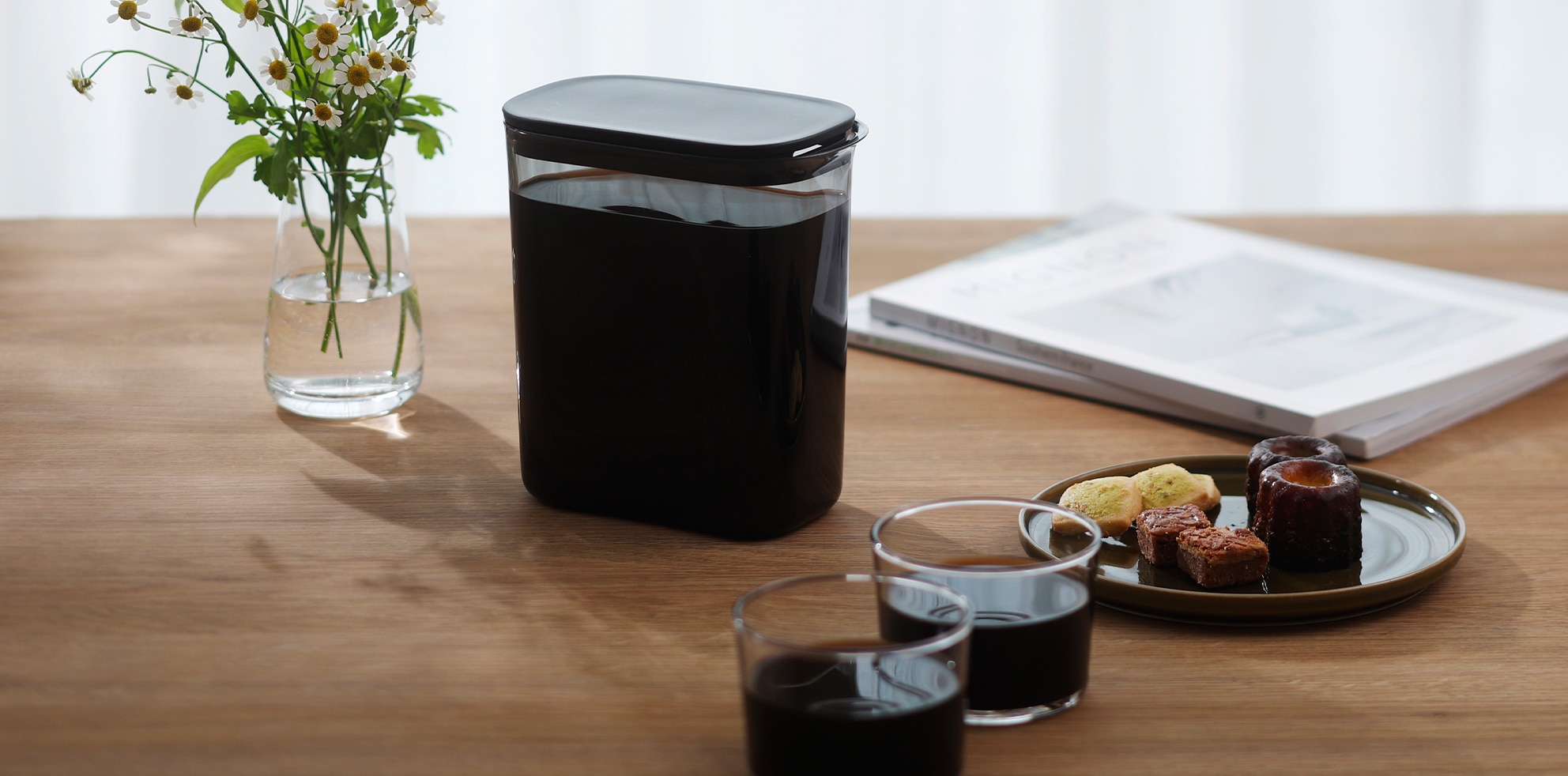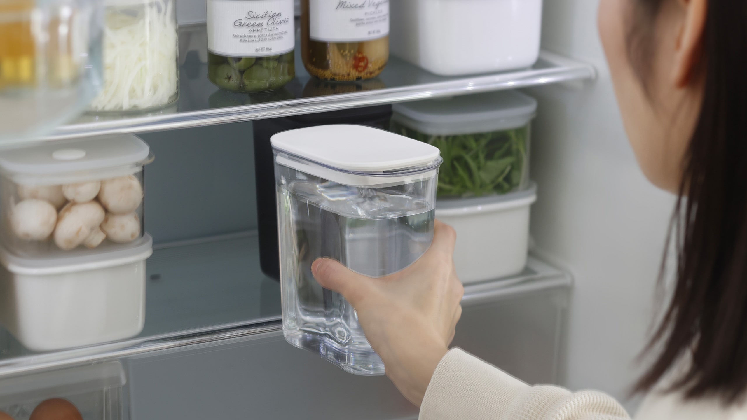 冷蔵庫の隙間に入る冷水筒です。棚にも扉の前ポケットにも入るコンパクトサイズ。注ぎ口は水切れがよく、パッキンのないフタと本体の2パーツでお手入れも簡単です。飲み物を入れて、冷やして、飲んで、洗う。冷水筒のすべてのサイクルをスムーズにします。