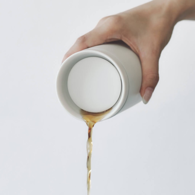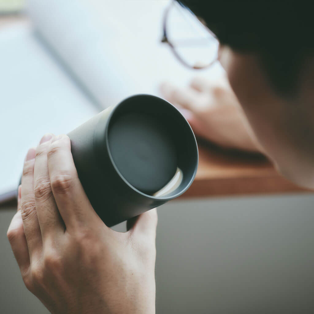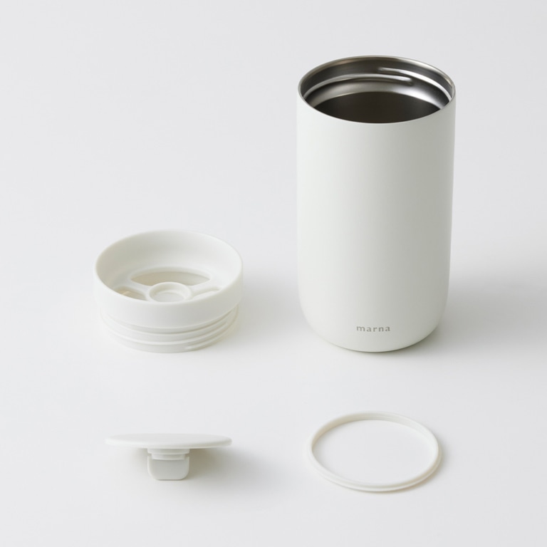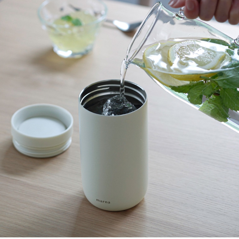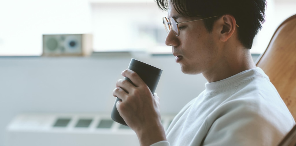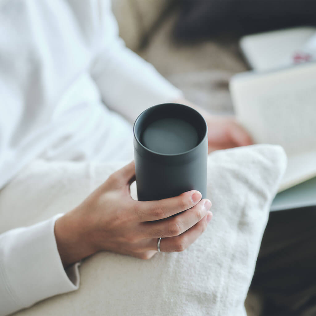 フタをしたまま、360°どこからでも飲めるタンブラーです。飲み口がなめらかで口当たりがよく、真空二層構造で飲みものの温度をキープ。何かをしながらでも、飲みものをおいしく愉しめます。
