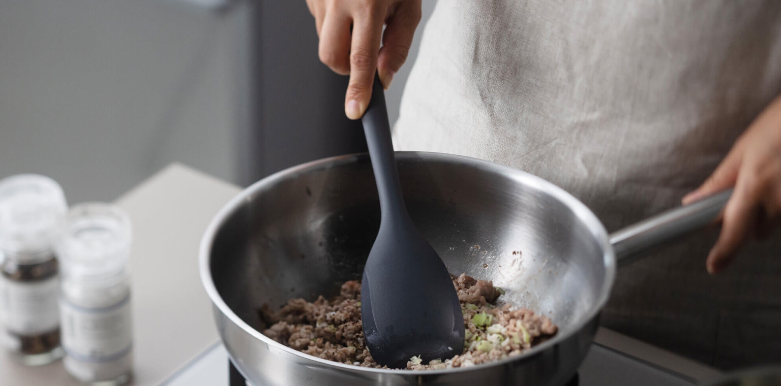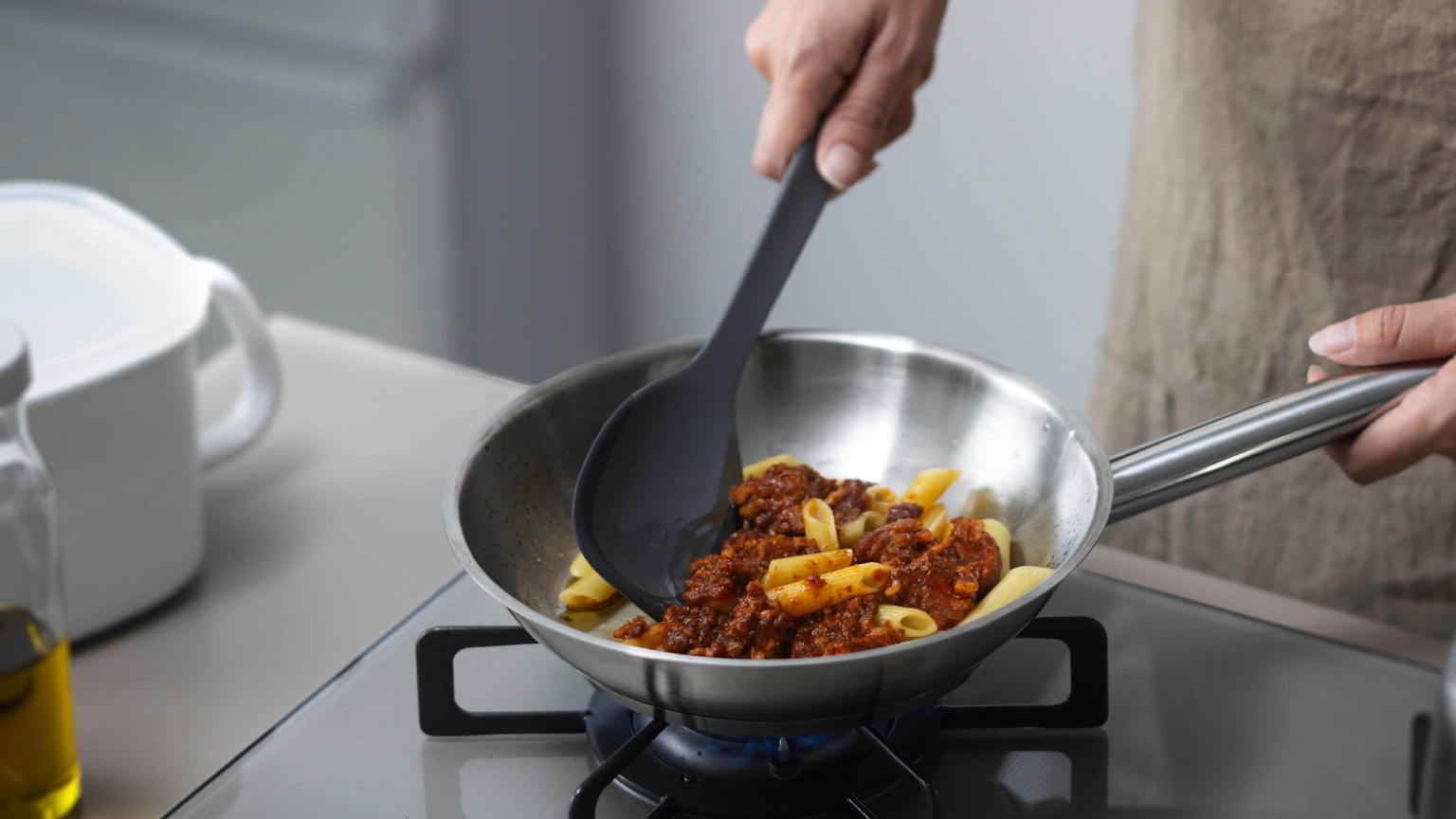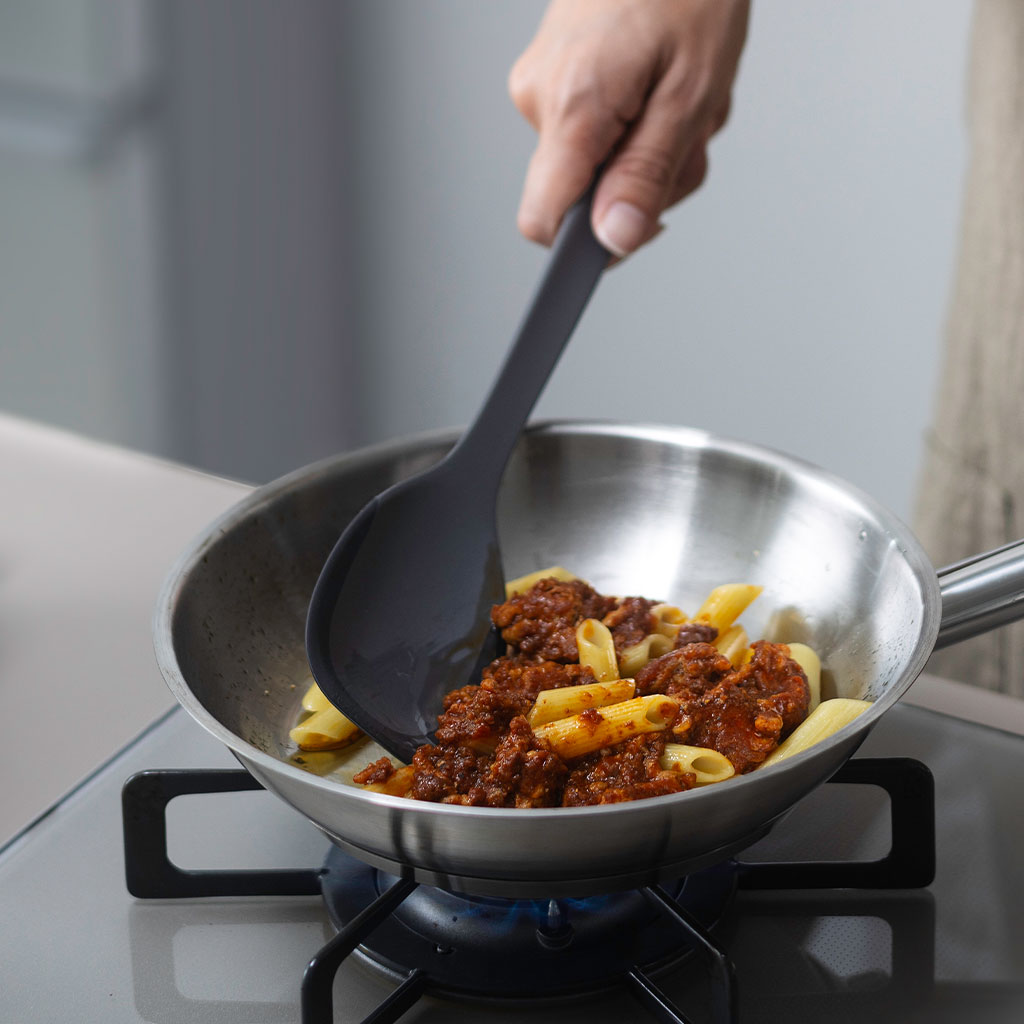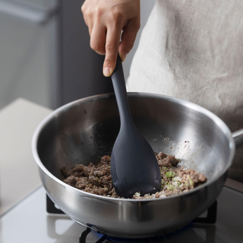フライパンや鍋肌に沿うスプーン形状と縁を囲うように付いたシリコーンで、残さずすくい取りながら混ぜられます。
