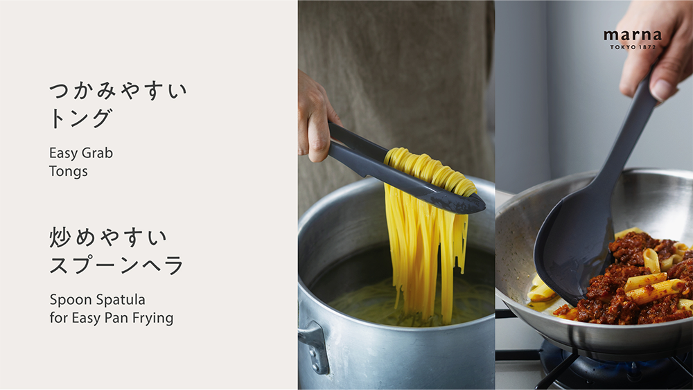 木べらのようなフラットな柄とコンパクトな幅で小回りがきき、炒めやすい形状です。