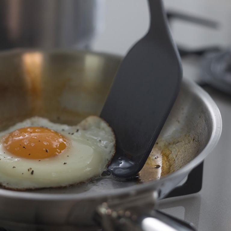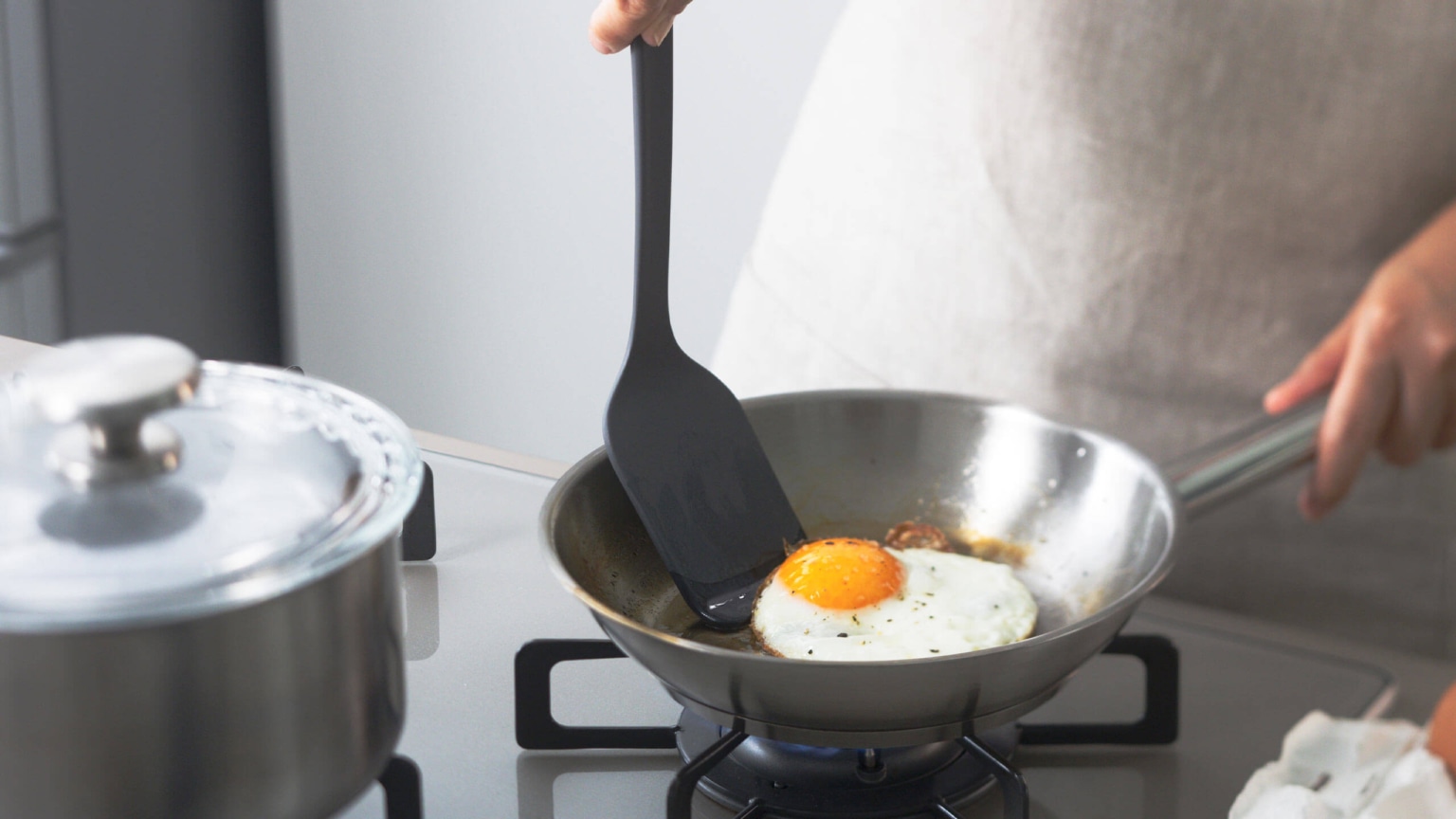 先端のシリコーンがしなって、小ぶりや深めなフライパンでも角度を選ばず差し込めます。