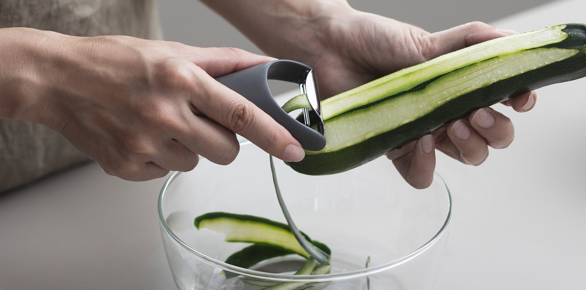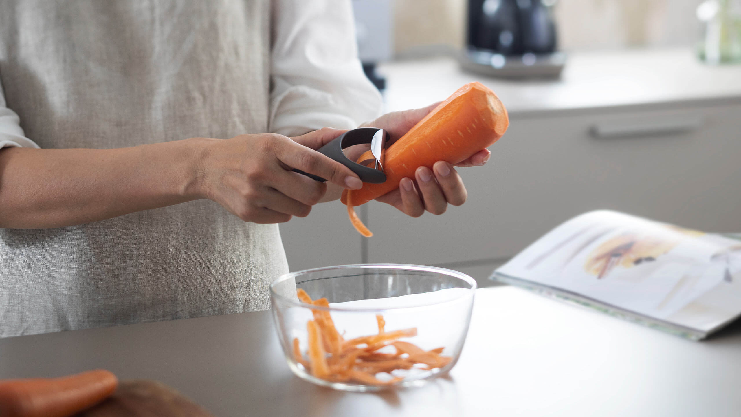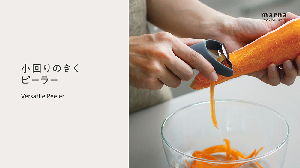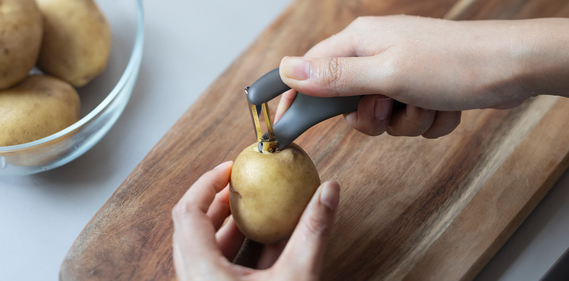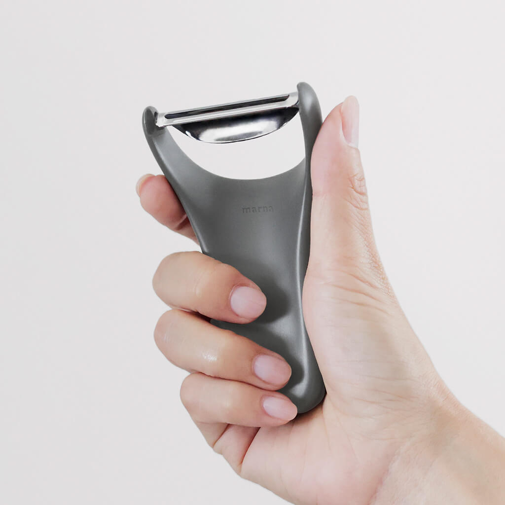 手になじんで動かしやすく、芽取りもスムーズにできるピーラーです。剥いた皮が張り付くことなく、下に向かってするんと落ちます。