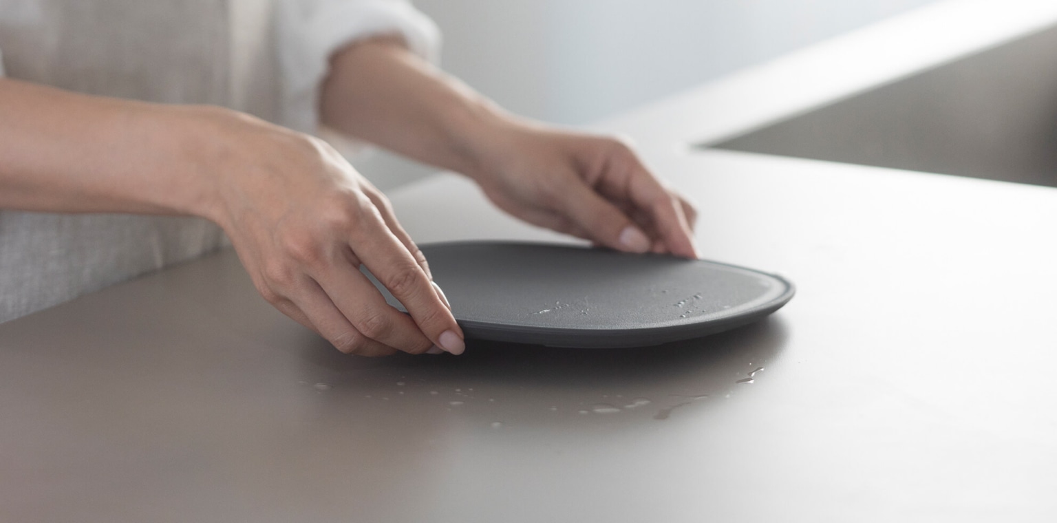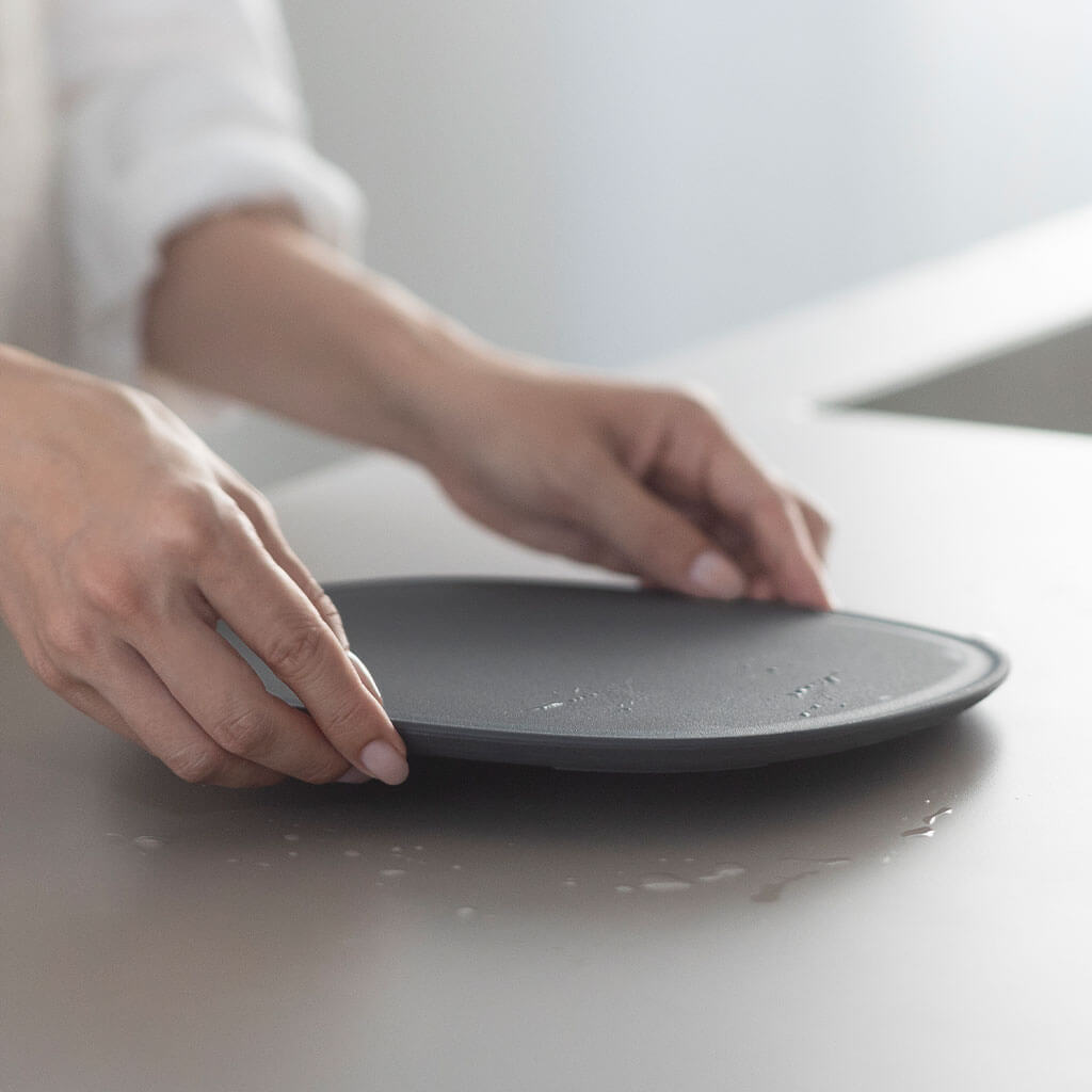指が入って持ち上げやすいフチ形状。調理台が濡れていても張り付かず、スムーズに移動できます。