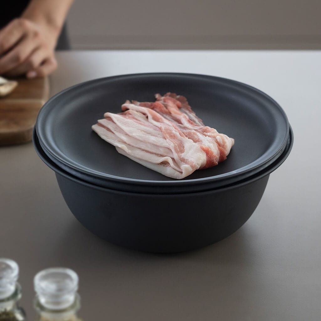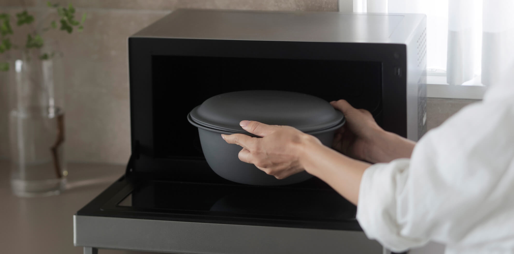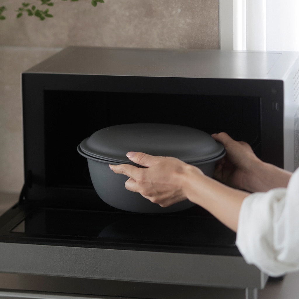 電子レンジで加熱するとボウルの中で蒸気が循環して、食材の水分を飛ばし過ぎずに調理できます。