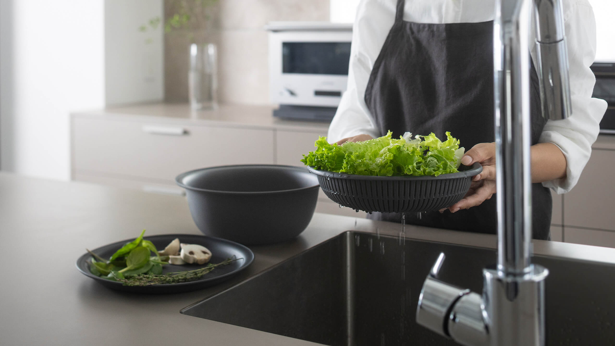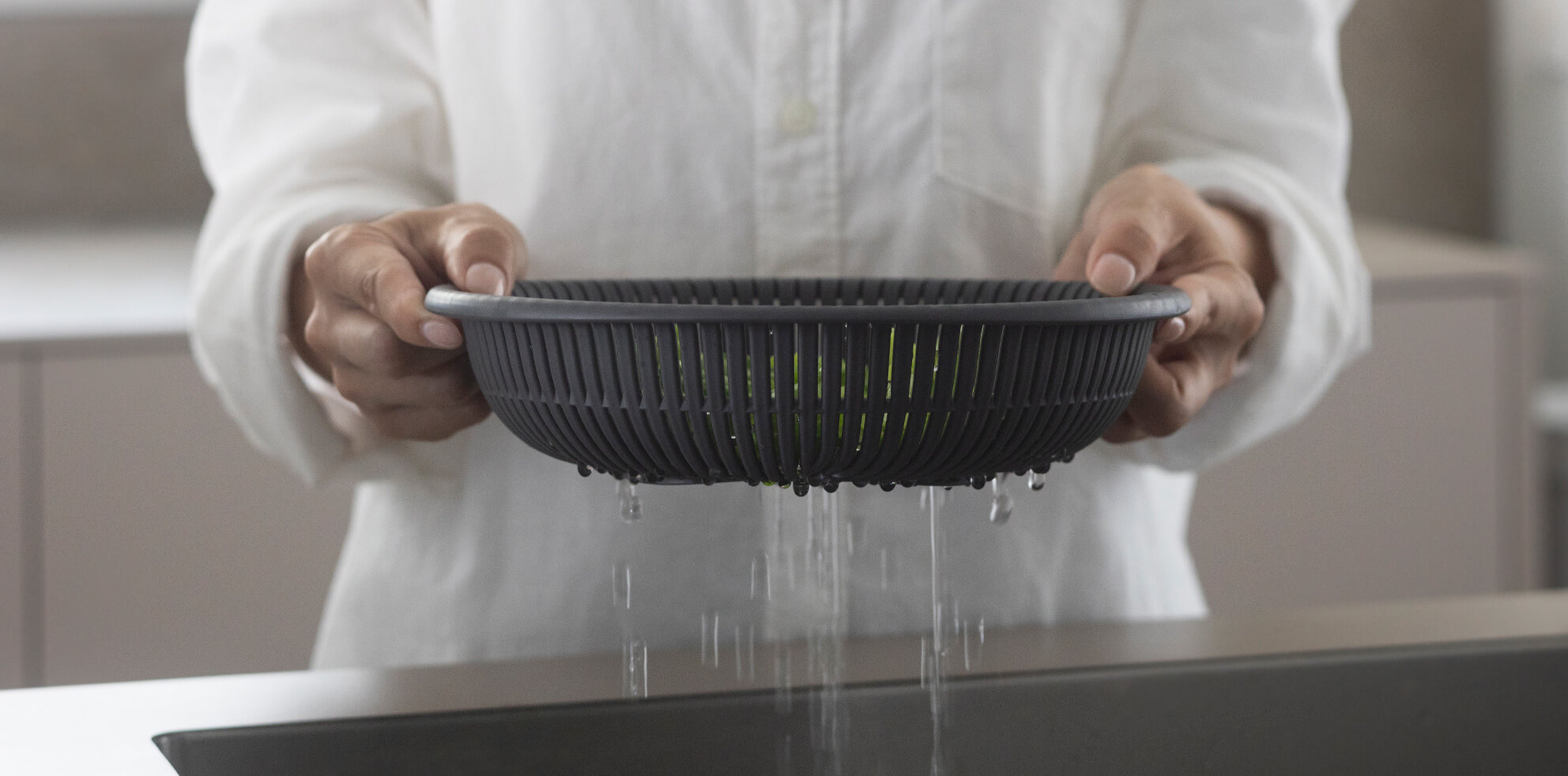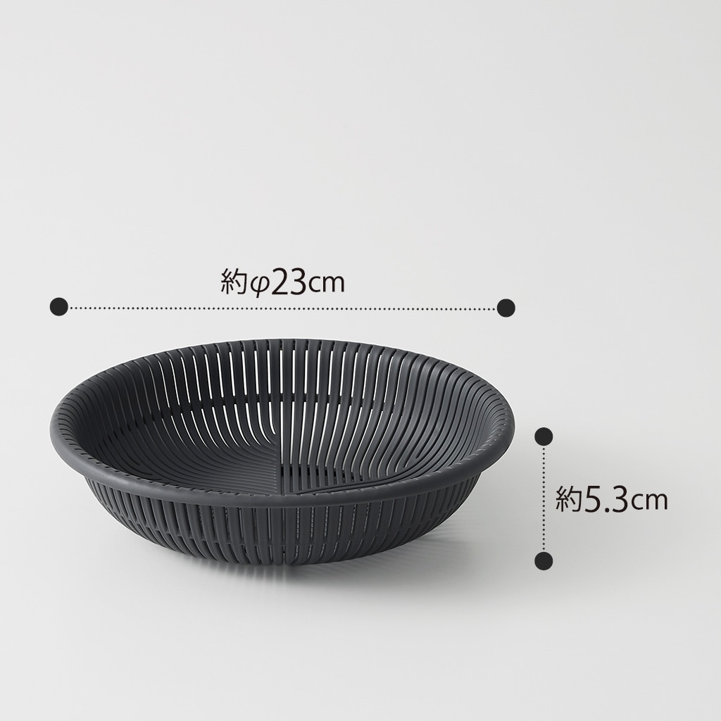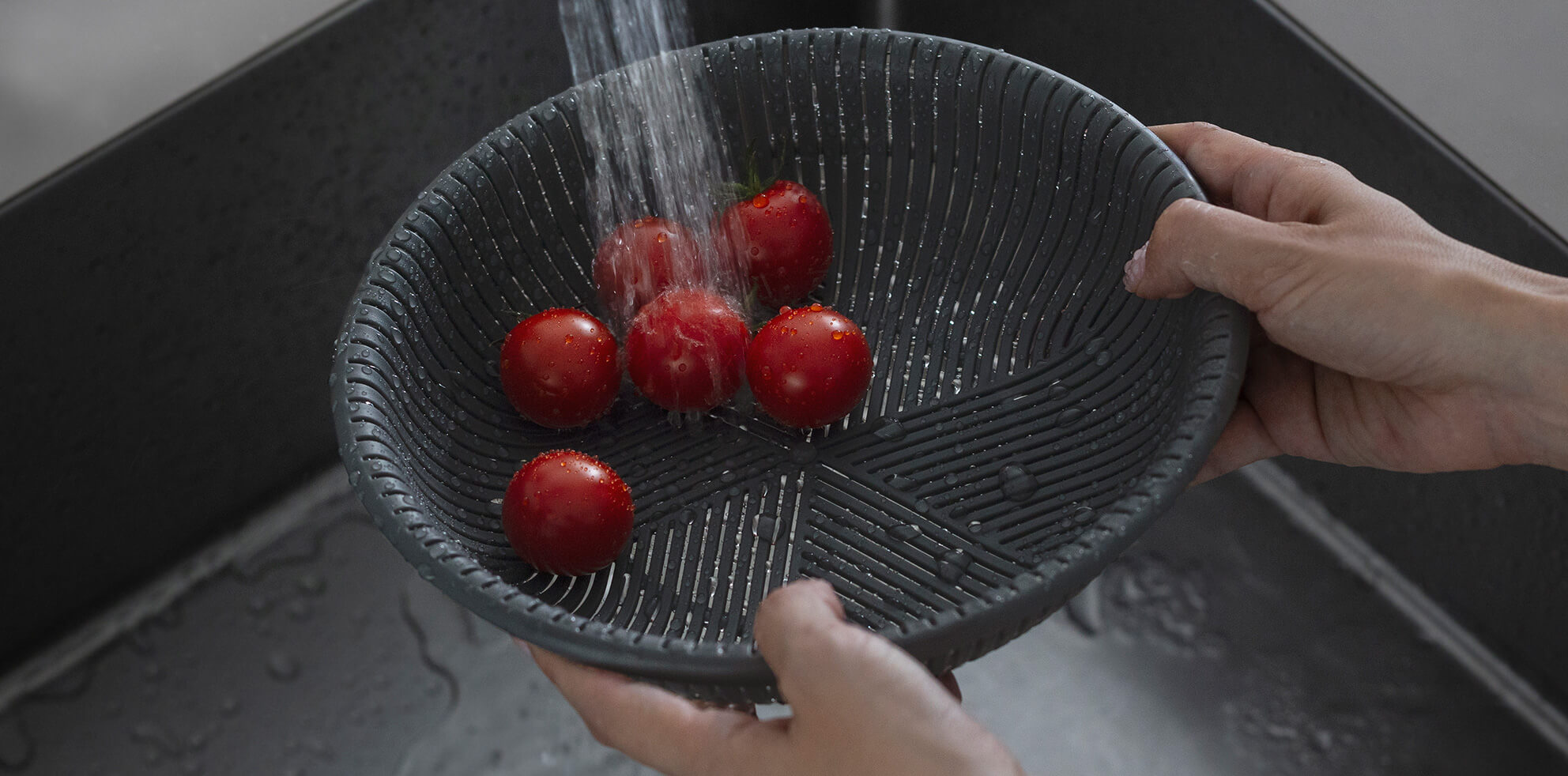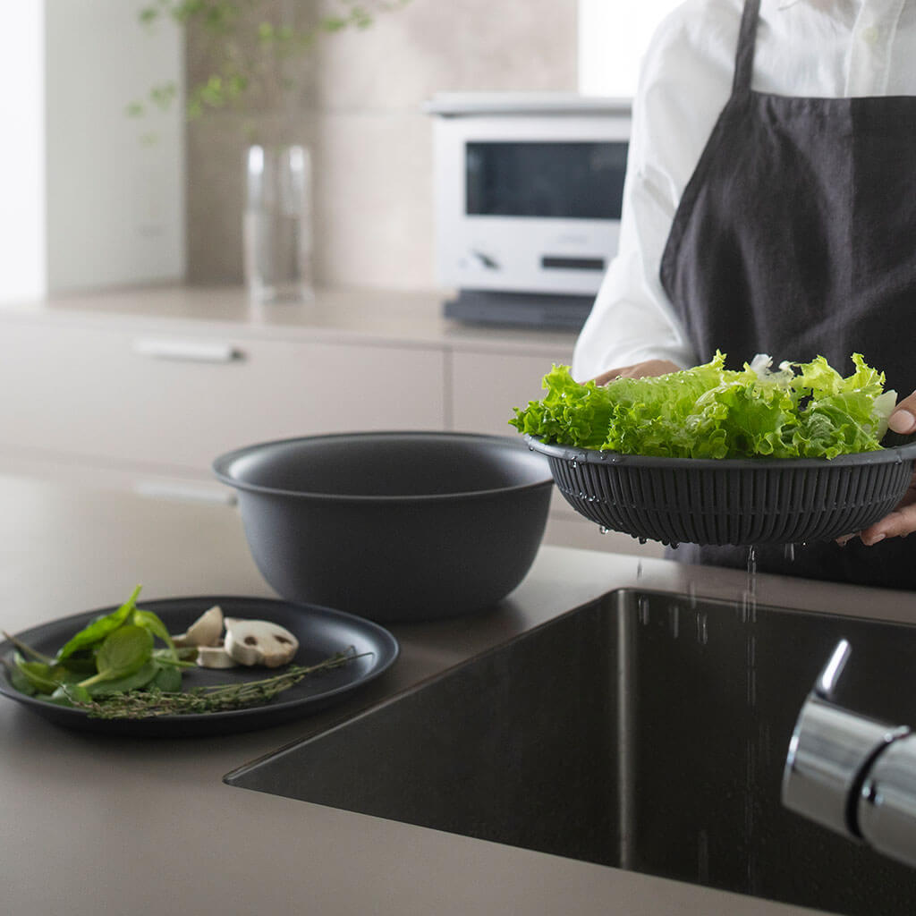 凹凸をできる限り少なくしたシンプルなかたち。ザルのスリットの角に丸みがあり、食材が引っかかりにくく、お手入れが楽にできます。