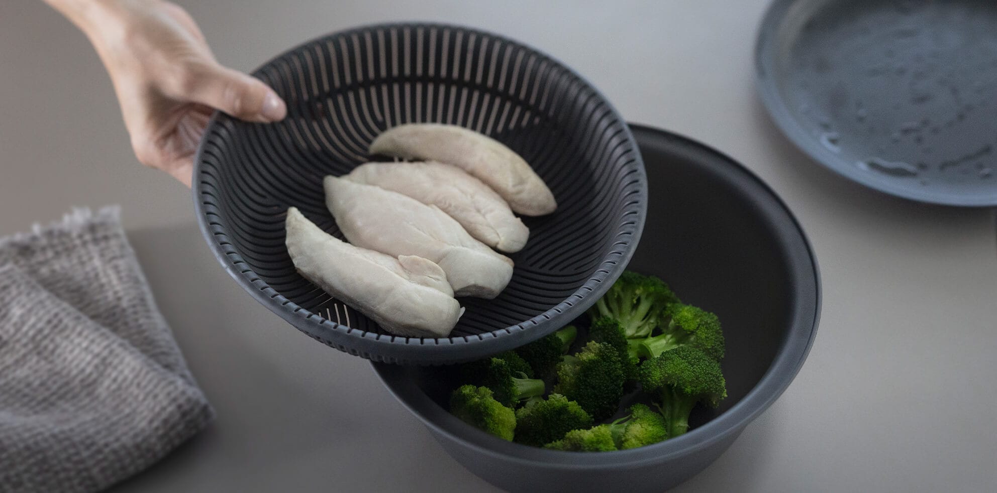 ザルとボウルの深さが違うため、2つの食材をそれぞれに入れて一度で加熱できます。