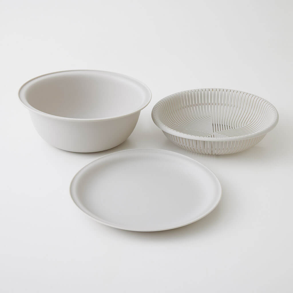 ザル・ボウル・トレーの3点セットです。それぞれを組み合わせることで、様々な使い方ができます。