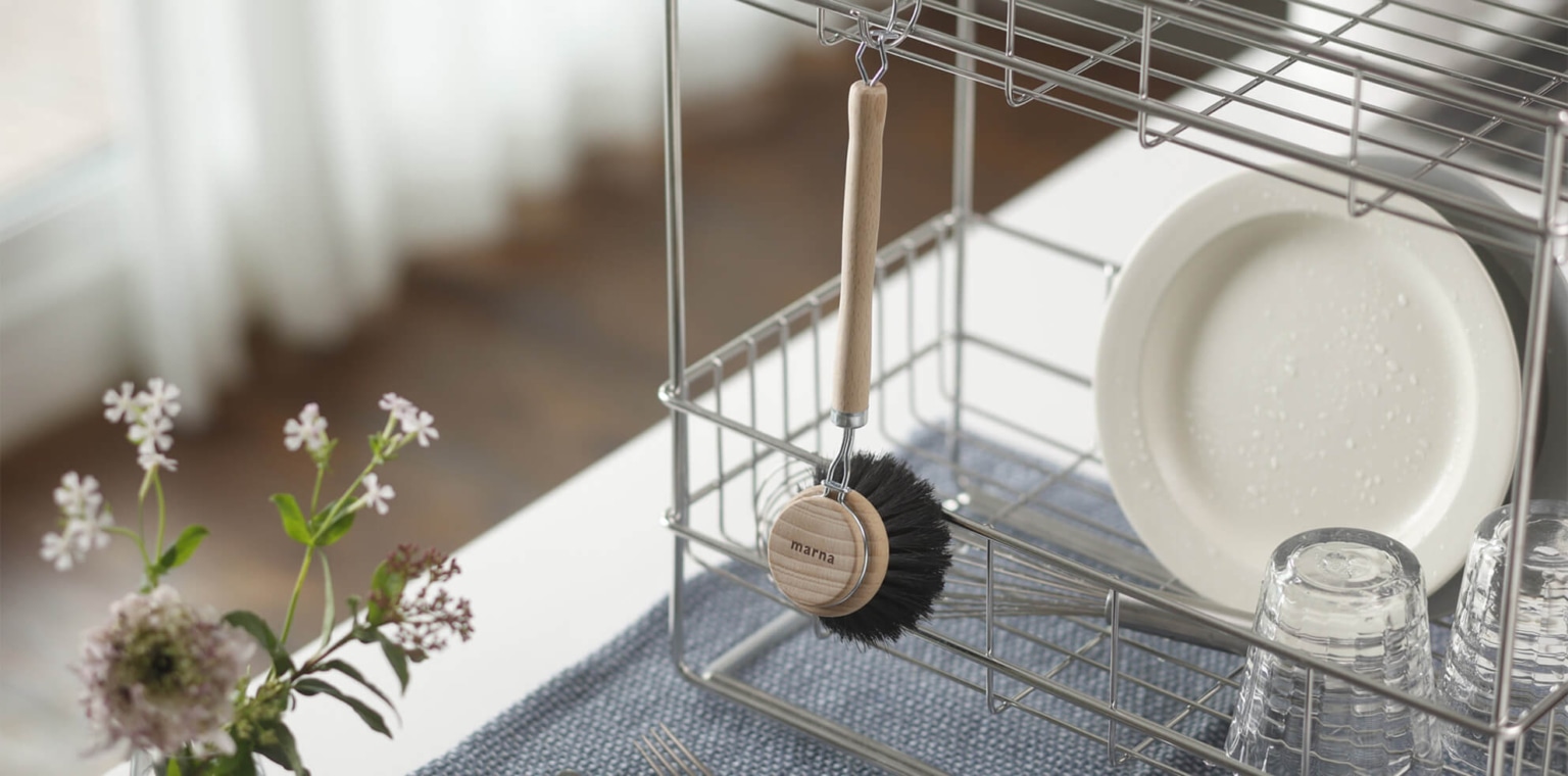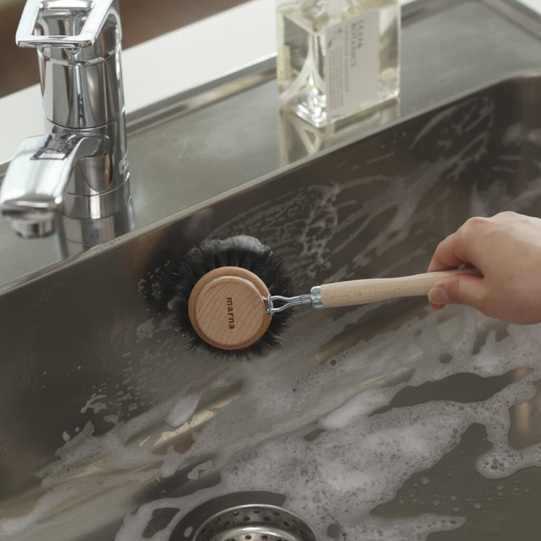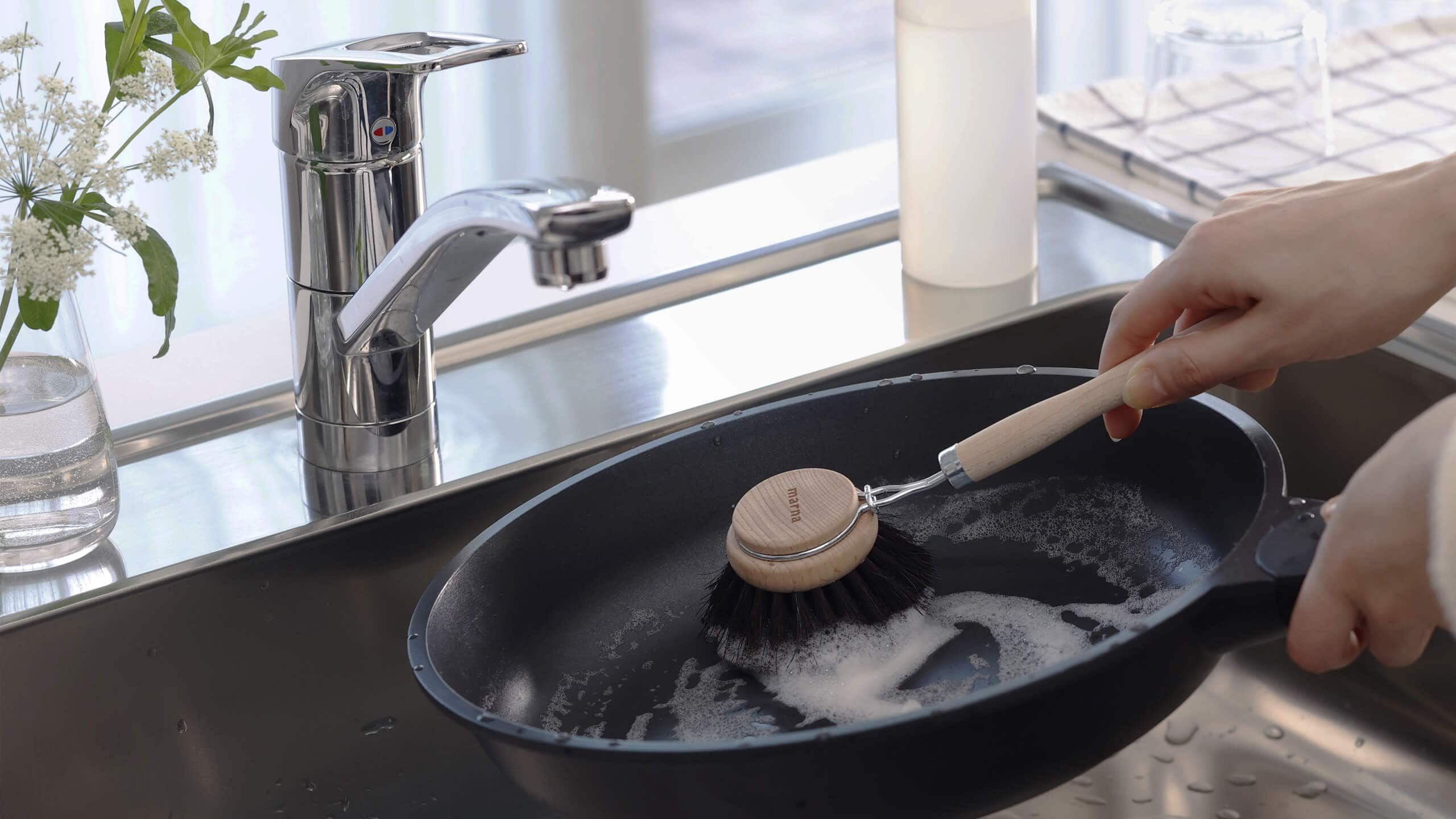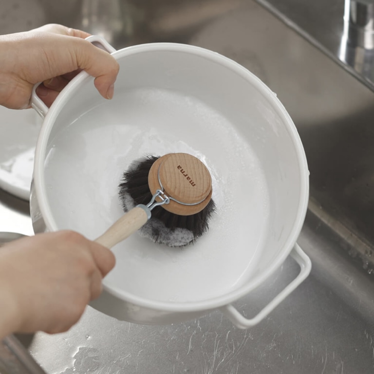 耐熱・耐薬品性に優れた、馬毛だけを使用した泡立ちのいい柄付きキッチンブラシです。キズが気になるフッ素樹脂加工のフライパンやホーロー鍋等もやさしく洗えます。