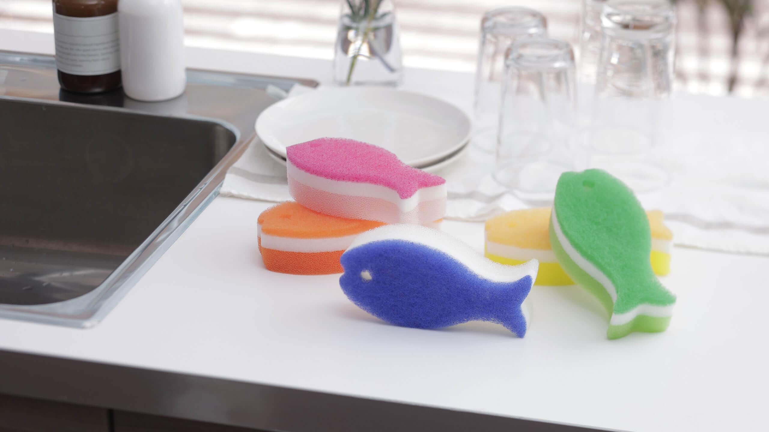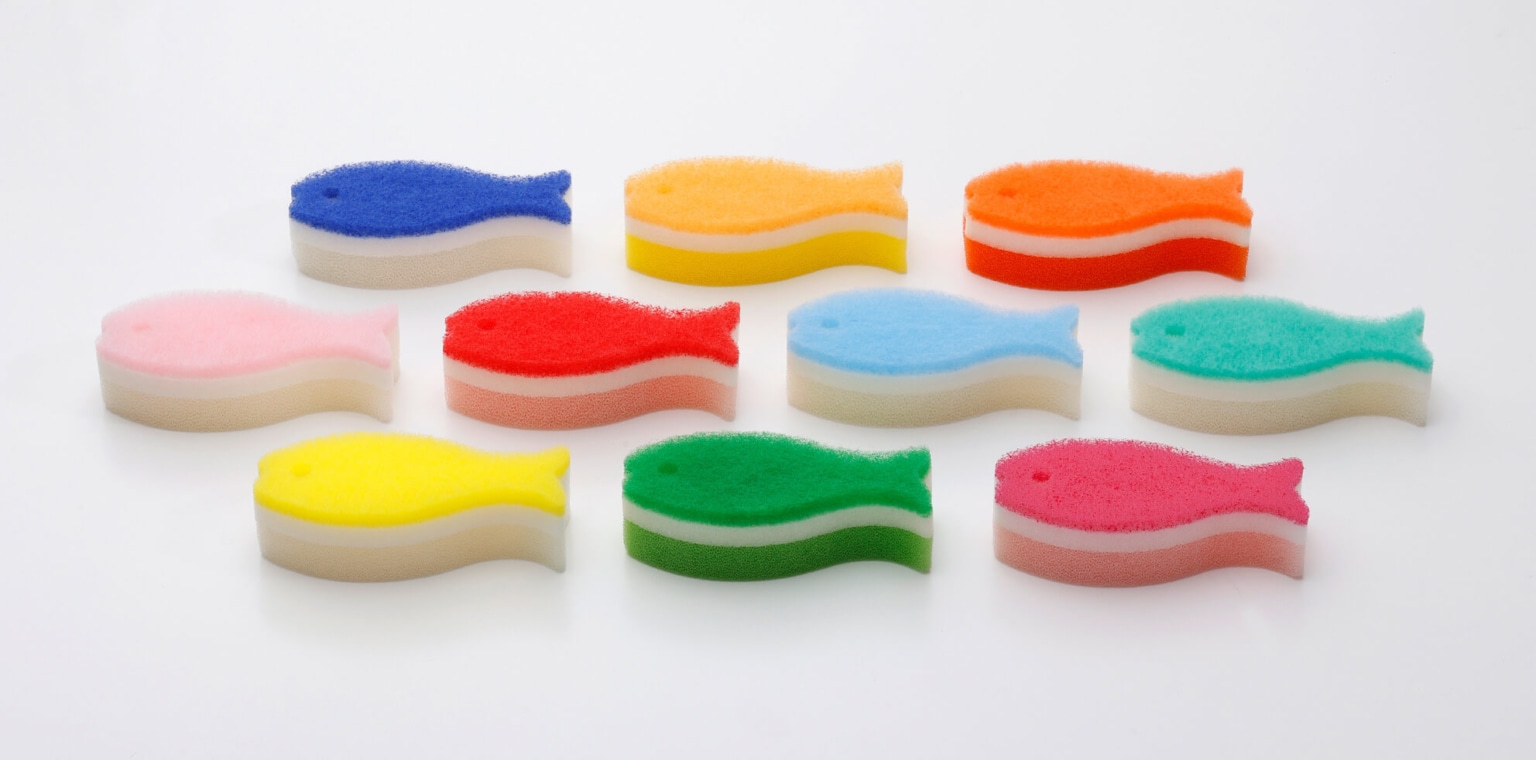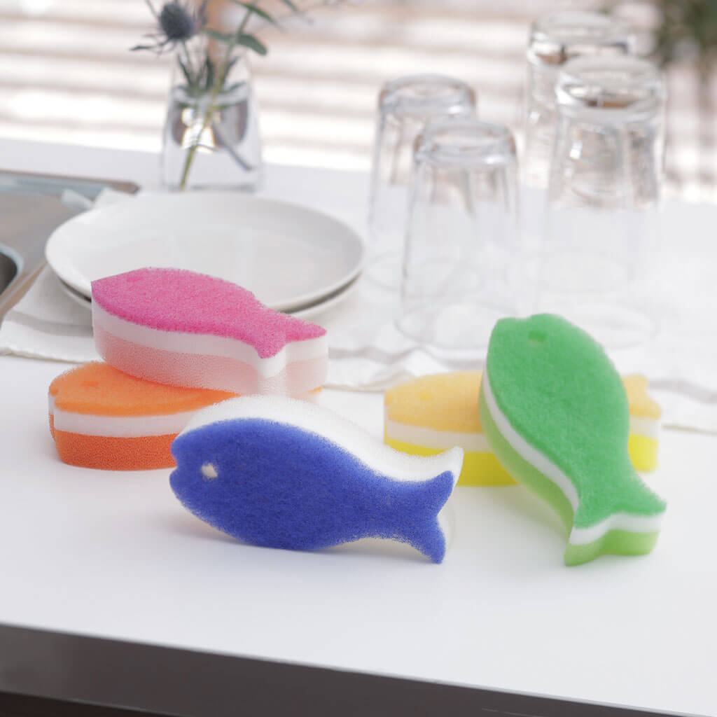 3層構造で泡立ち・泡持ちに優れた、おさかなのかたちのキッチンスポンジです。カラフルな10色を1つのセットにしました。