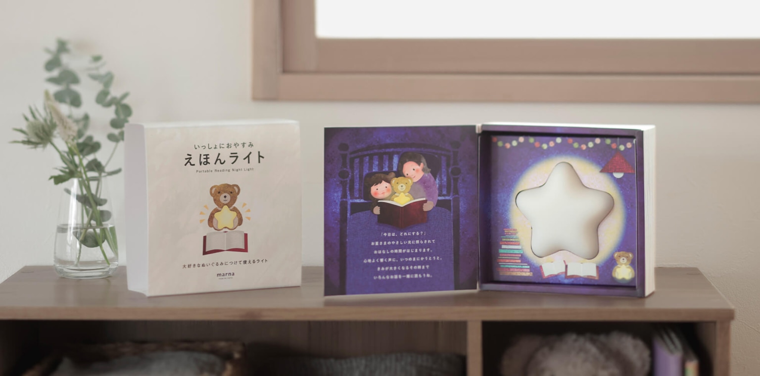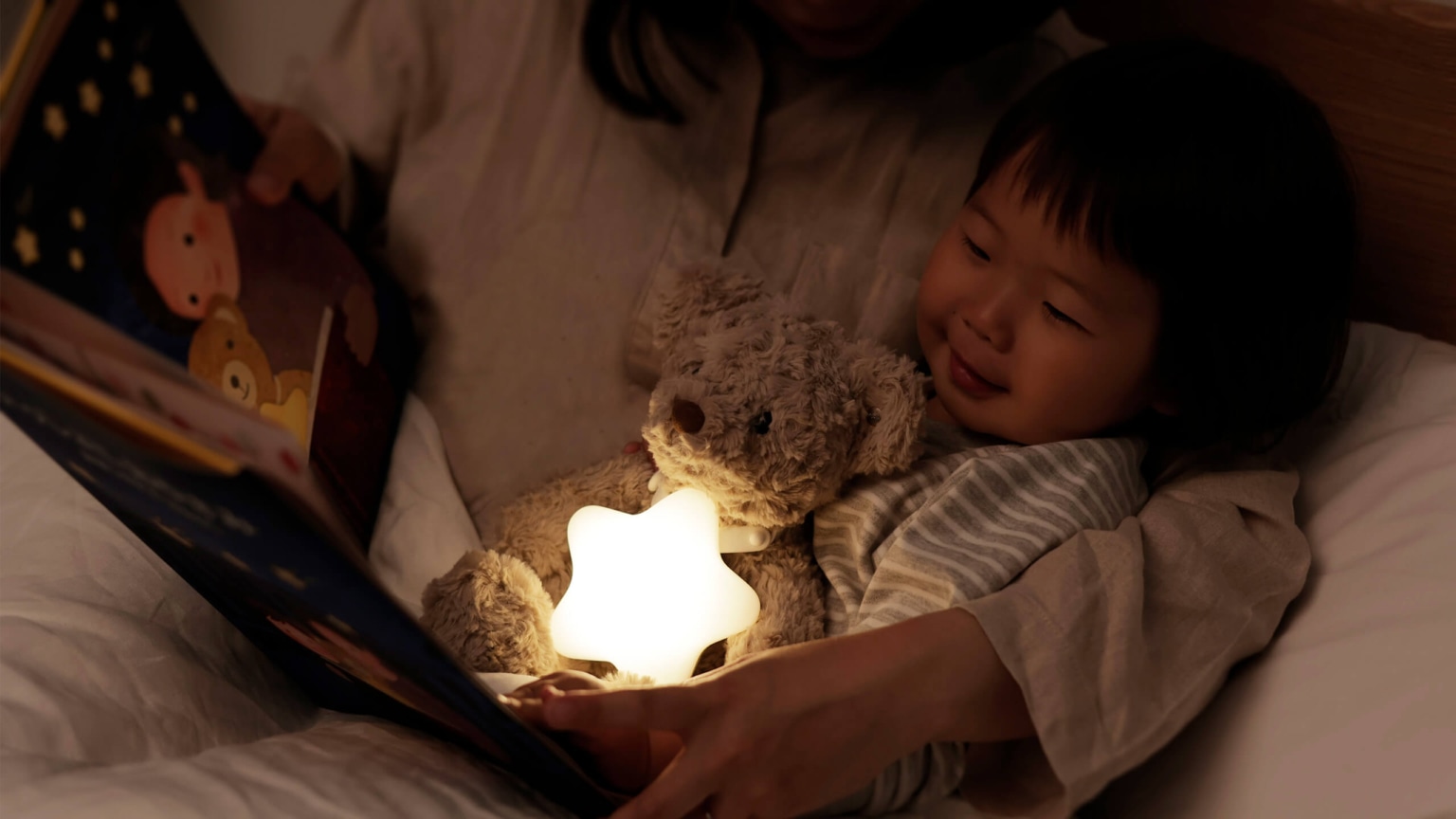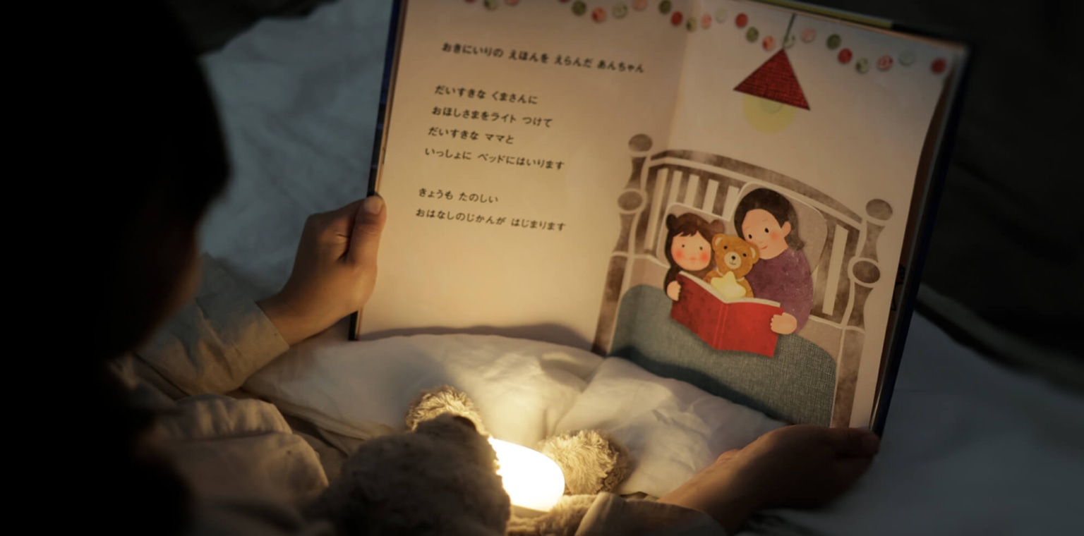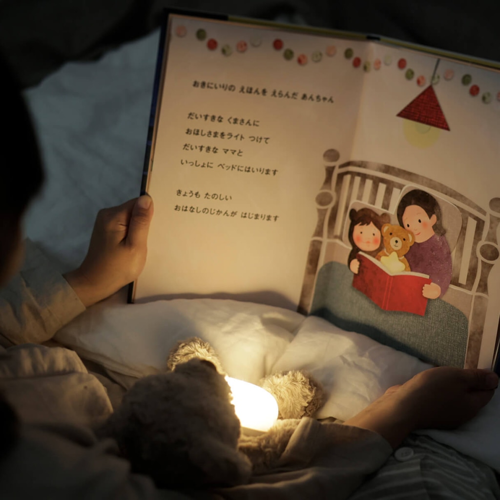 電球色のあたたかい光で絵本を照らし、おやすみ前の心地よい時間を演出します。30ルクス以下※の暖色系の明かりで眠りを妨げません。※ライトから30cm(垂直方向)の距離で計測した場合