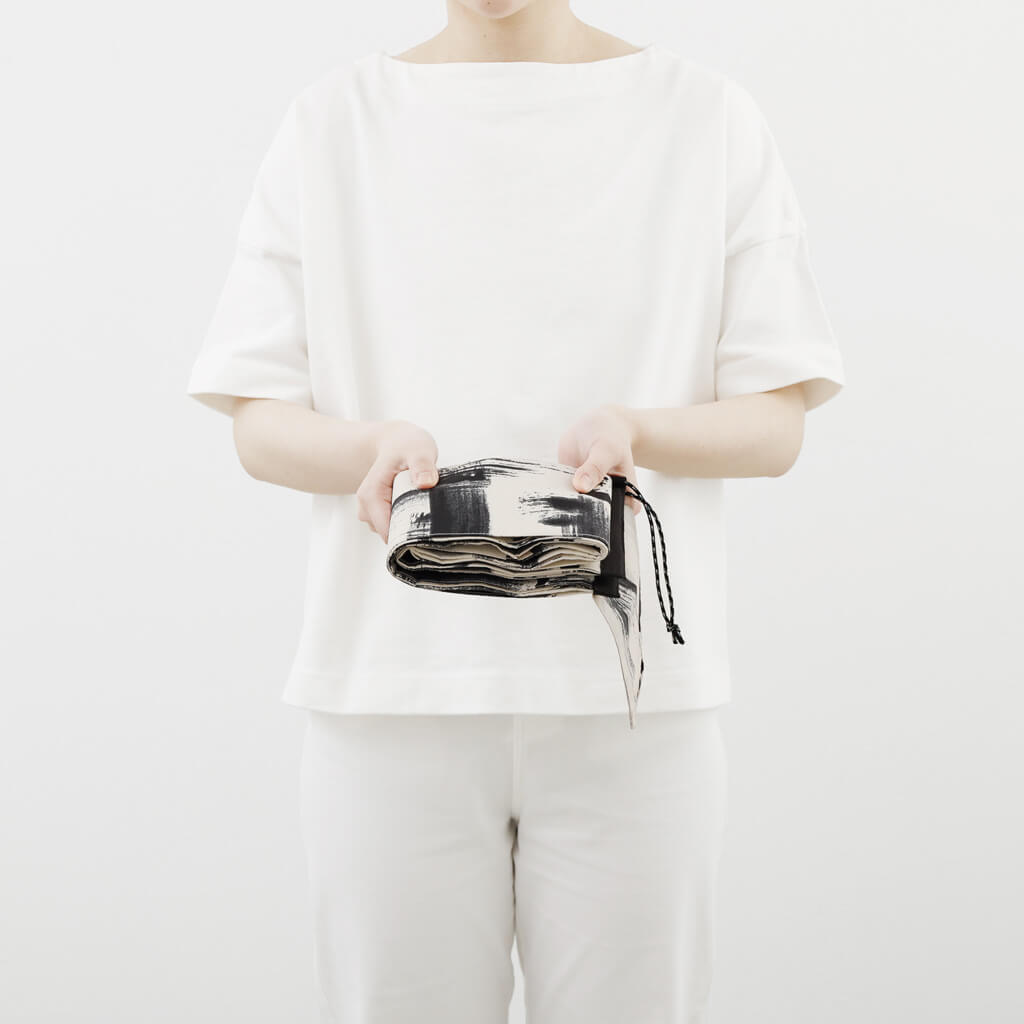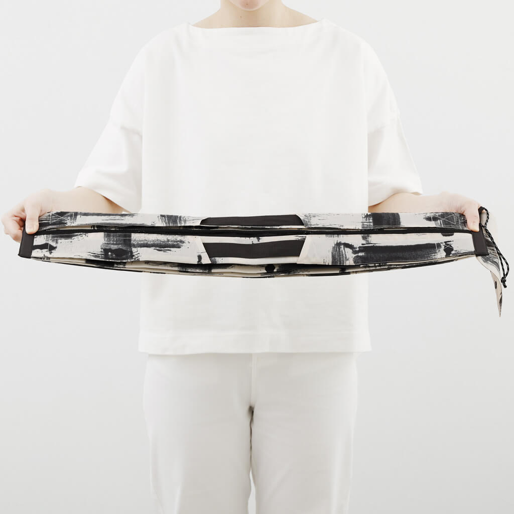 両端を引っぱると一気に帯状に。あとは3回半分に折ってボタンで留めるだけ。