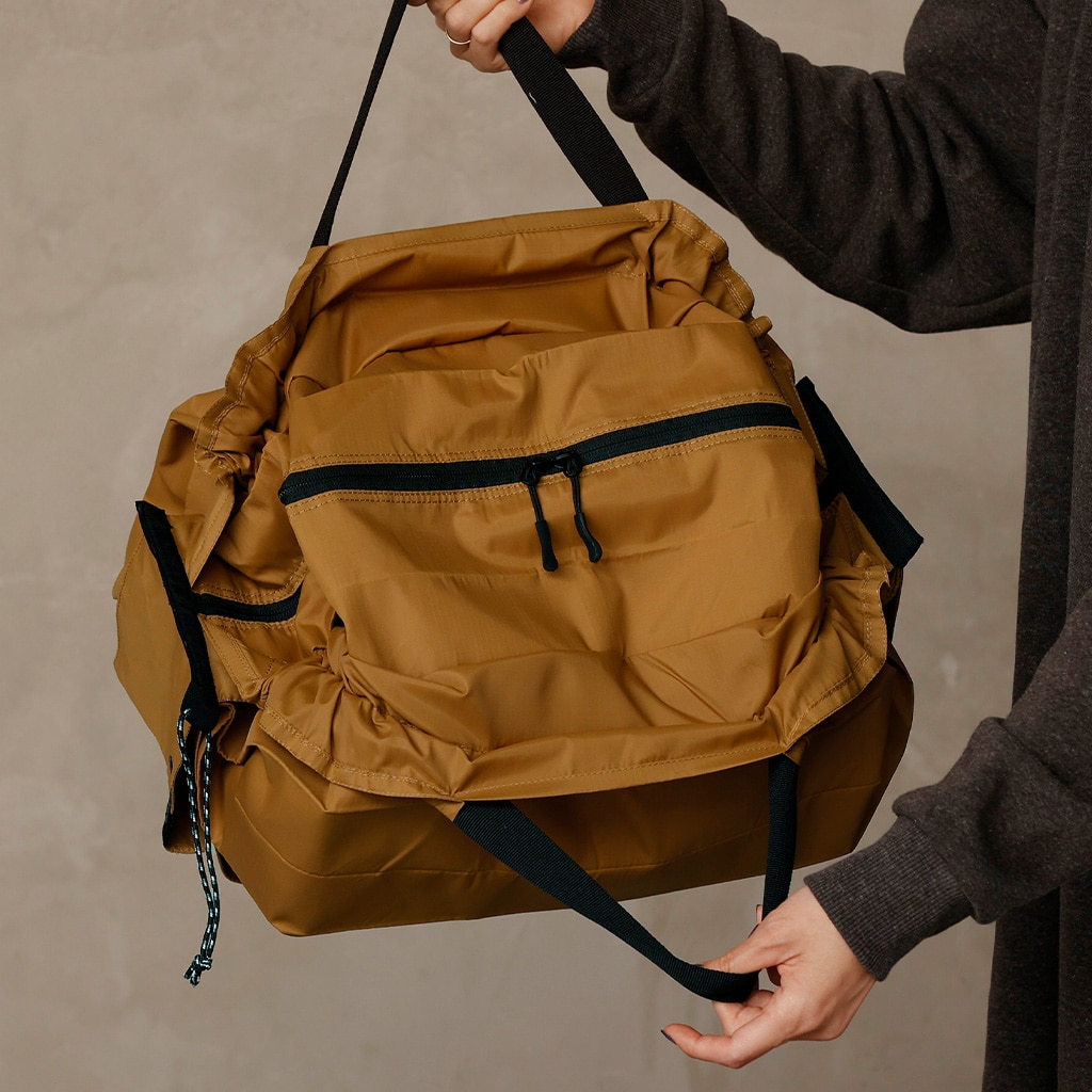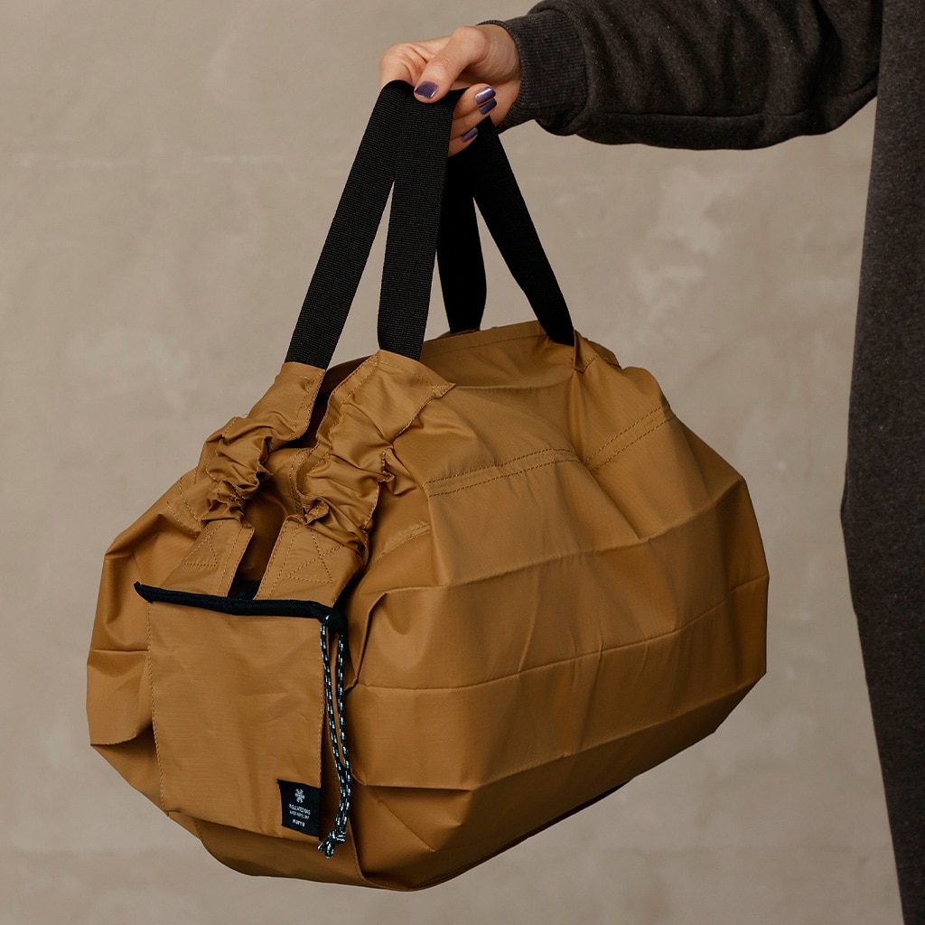 手提げひも付きで携帯性が良く、日常のお買い物からアウトドアシーンでの買い出しまで、さっと取り出して使えます。スーパーのカートにも掛けられます。