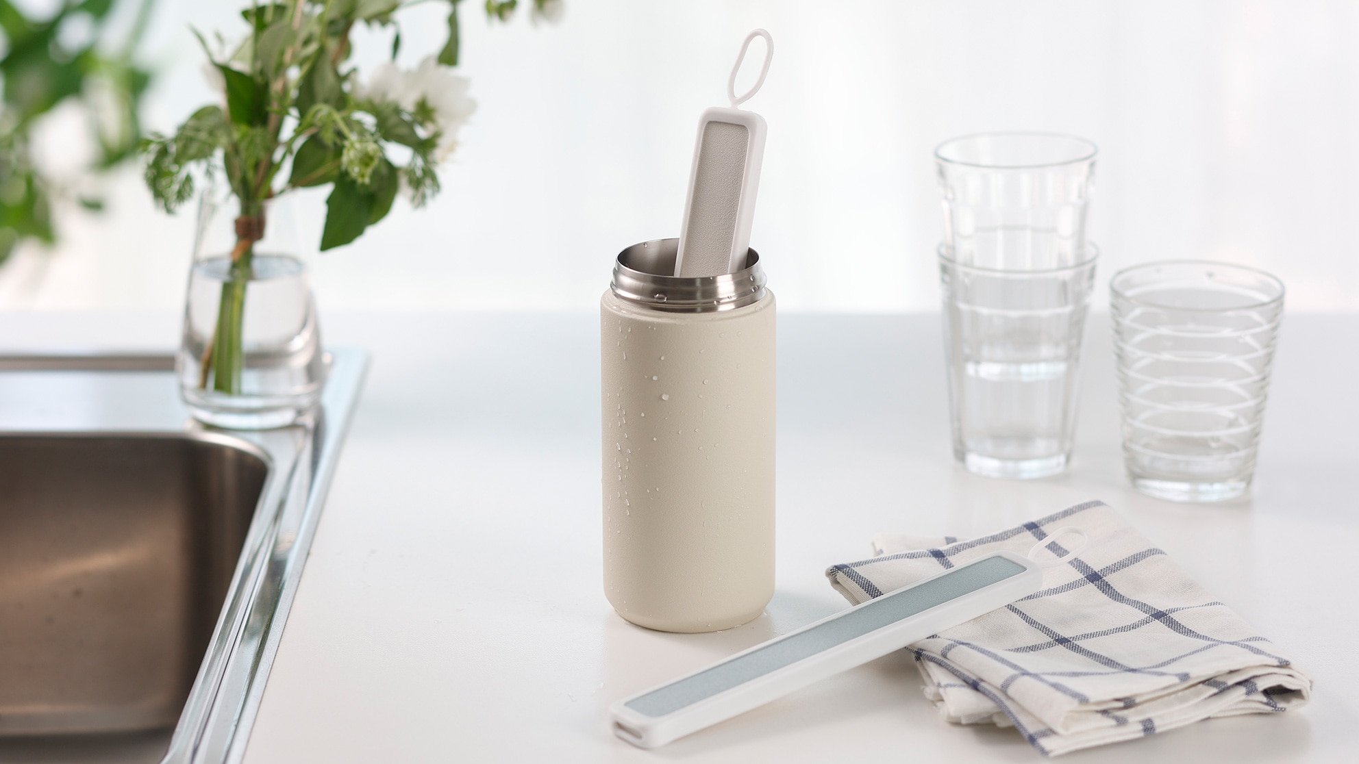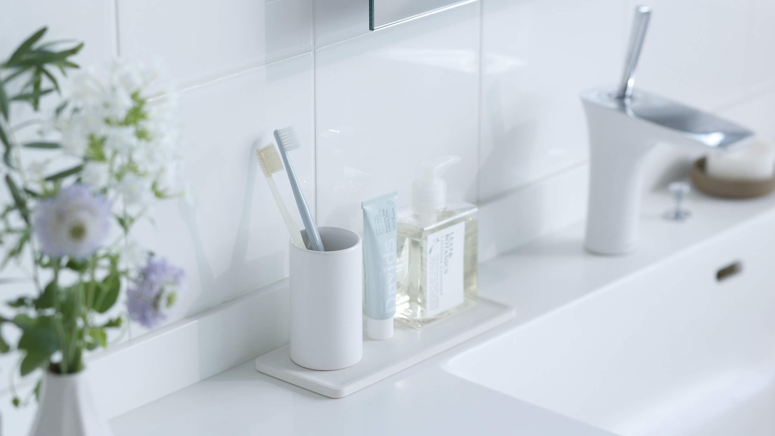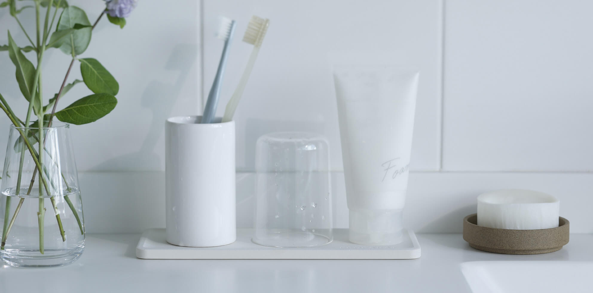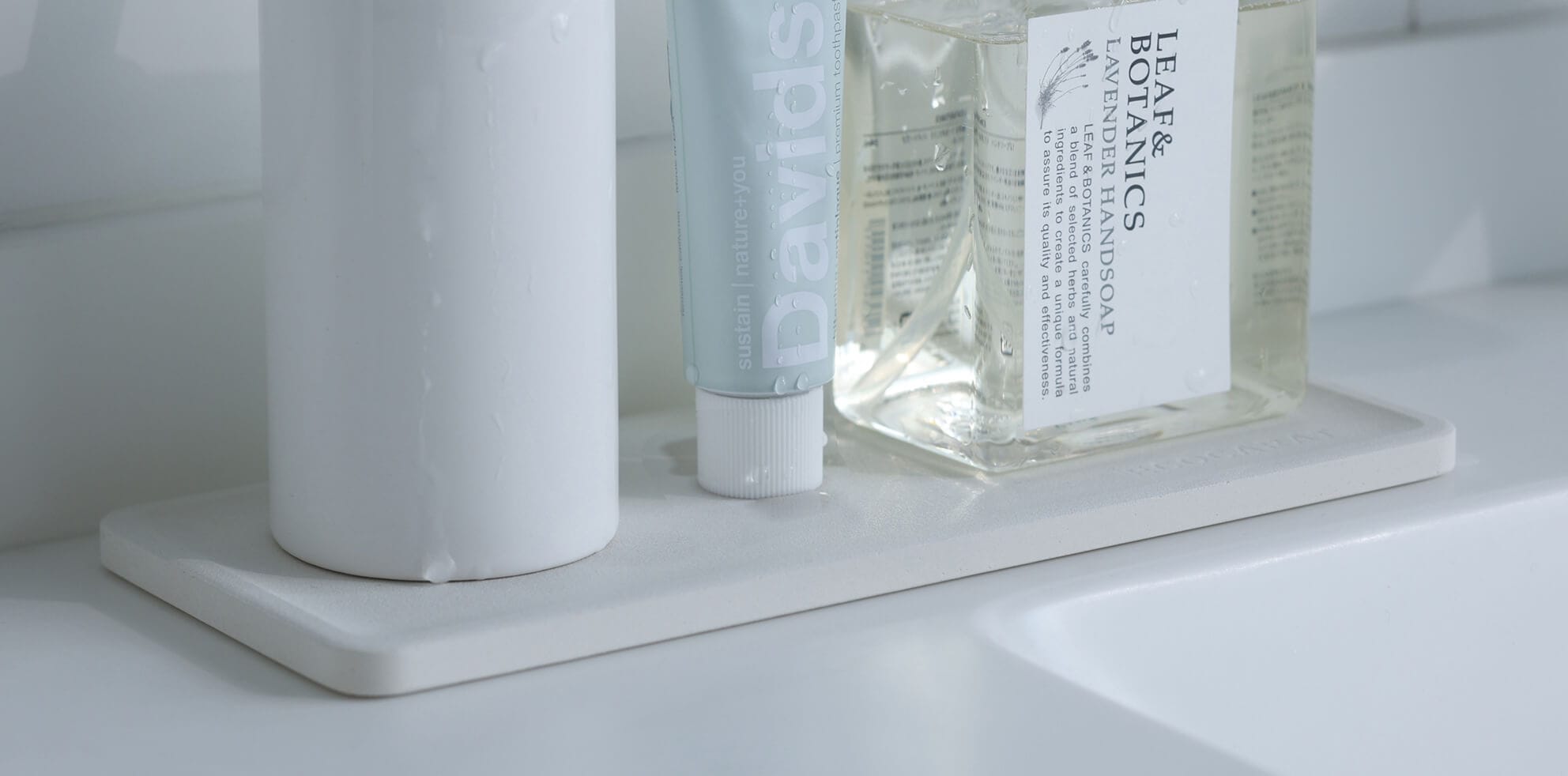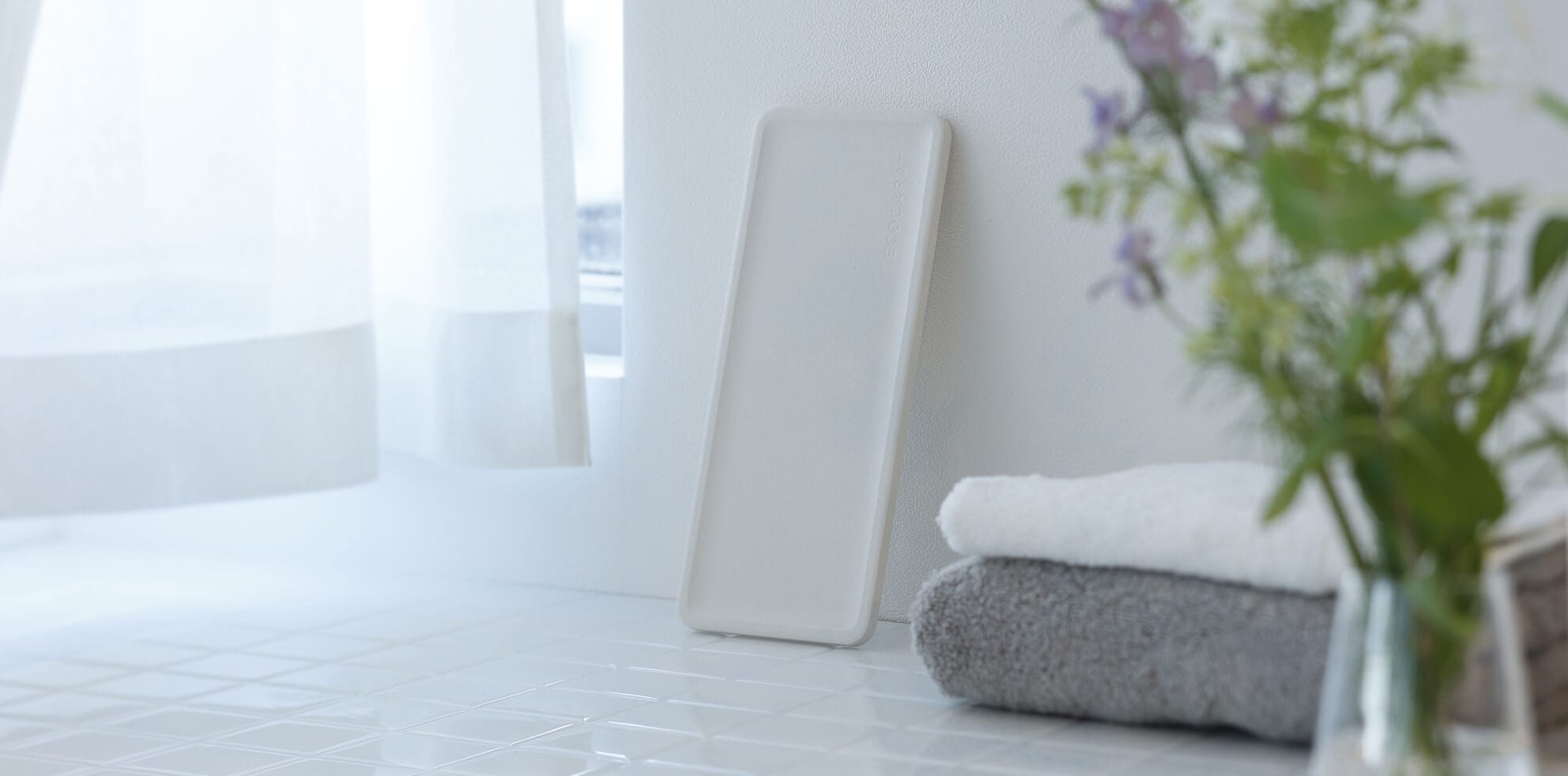 洗面まわりのコップ、歯ブラシ、歯磨き粉などの小物の水滴をすばやく吸収します。薄い板状で、使用後は立てかけて乾燥させながらコンパクトに収納できます。