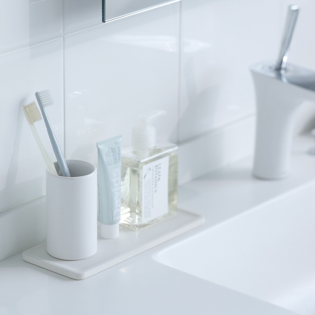 うがい用コップ、歯ブラシなど、洗面小物のトレーに。滴る水分を吸収するので、洗面台のお手入れも簡単になります。