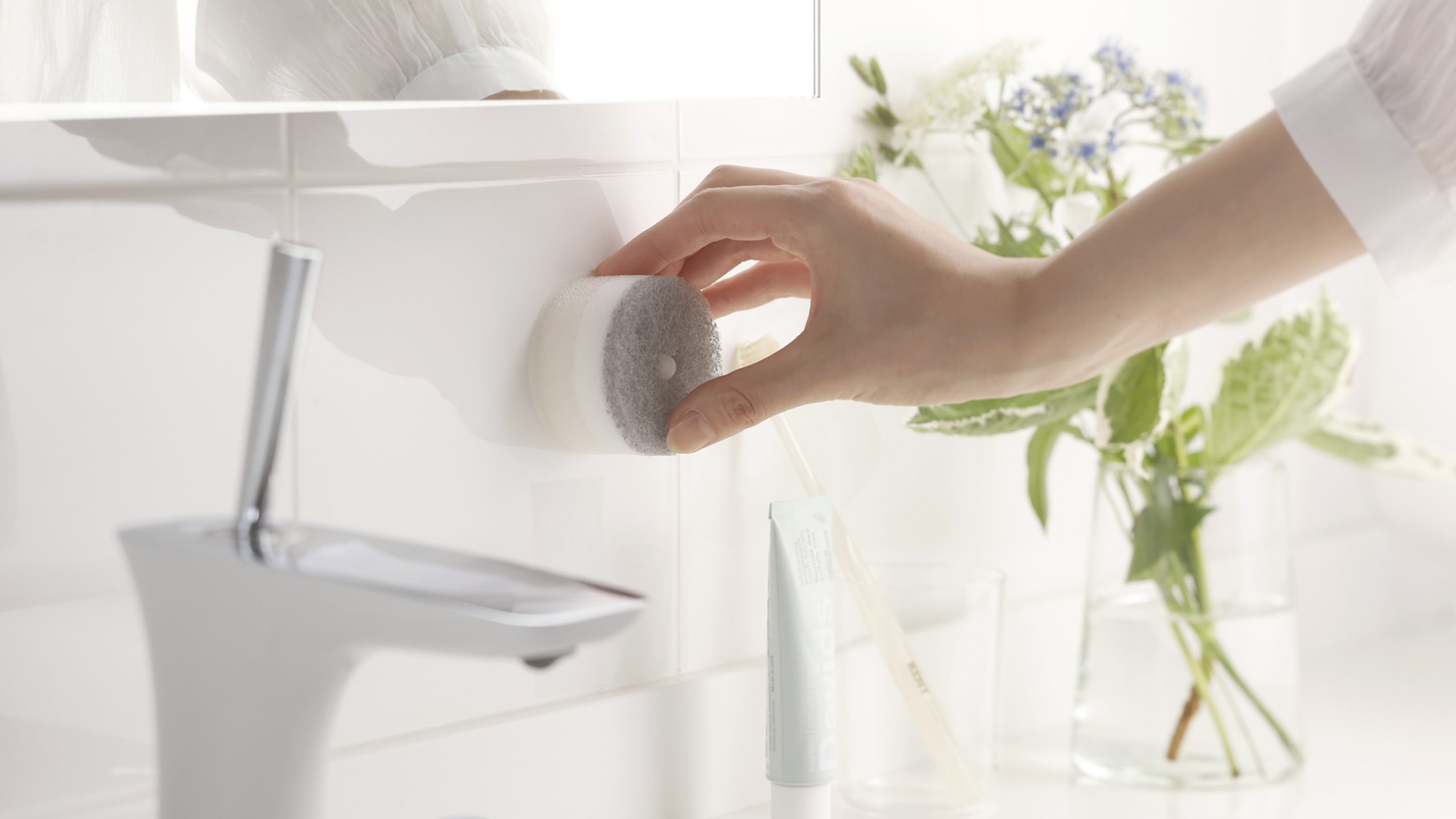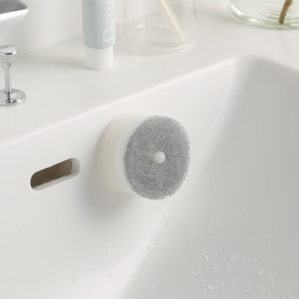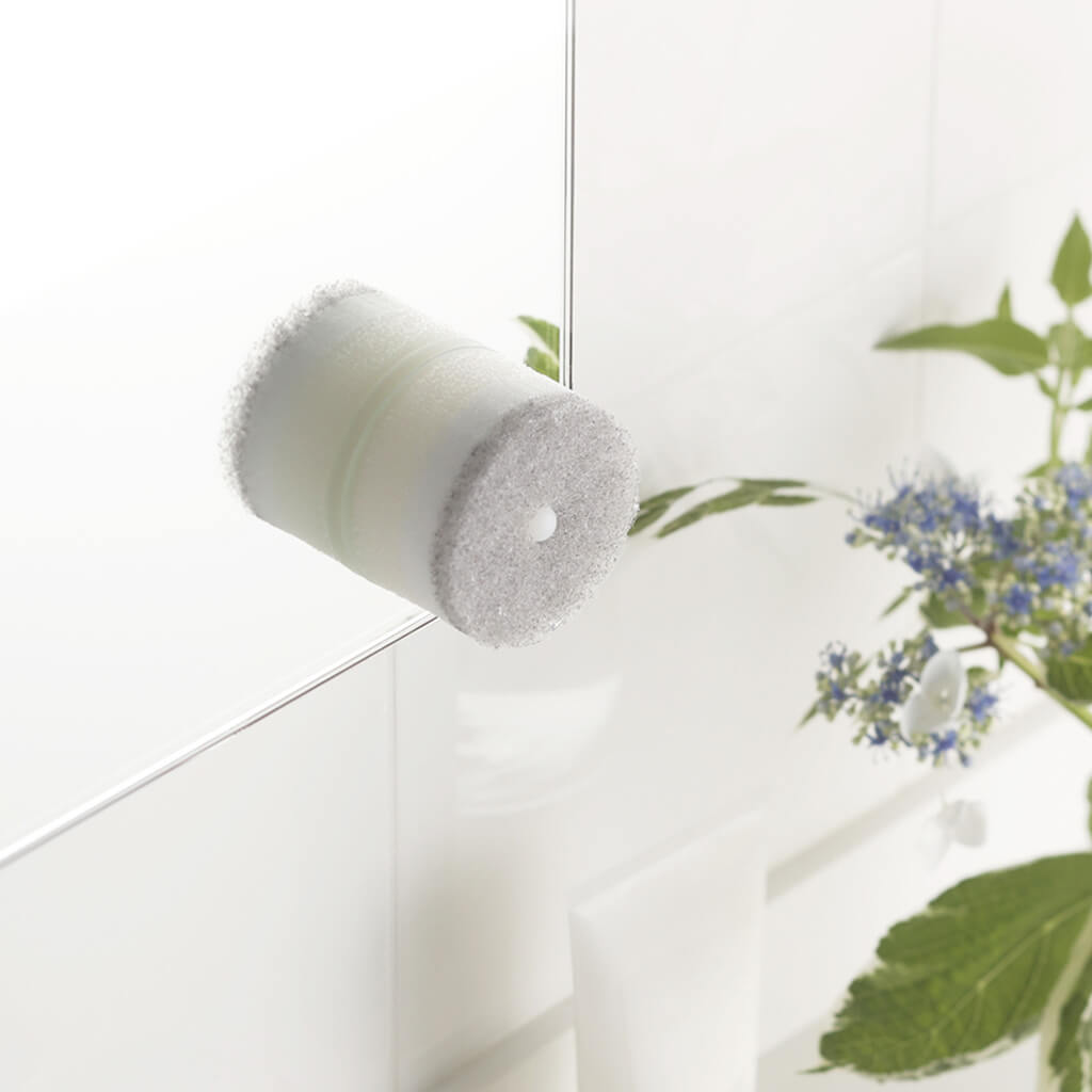 洗面台まわりの好きな位置に吸盤で取り付けるスポンジ。泡立ち・耐久性に優れ、通気性がよくスポンジを清潔に保ちます。